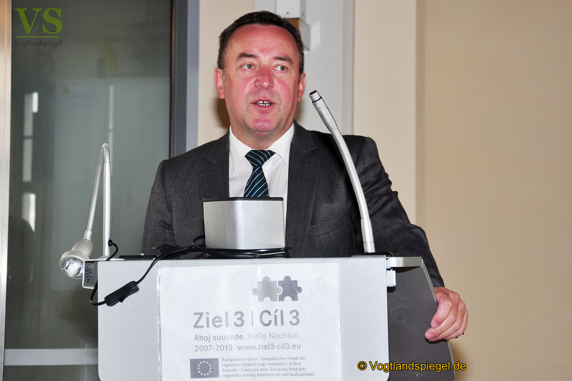 Der Oberbürgermeister der Stadt Plauen und Präsident der euregio Egrensis, Ralf Oberdorfer, spricht ein Grußwort an die Teilnehmer des Projekttreffens.