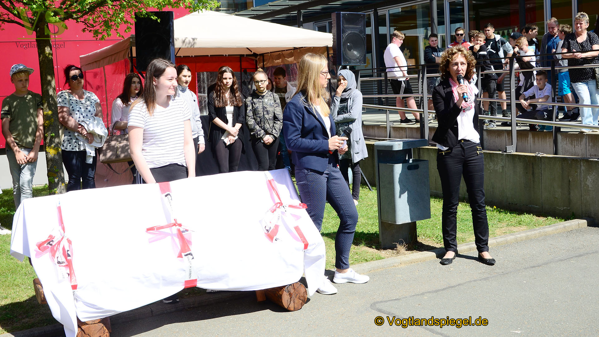 Zur feierlichen Enthüllung der Open Air-Besprechungsecke durch Schulleiterin Silke Solf (l.) Schülersprecherin Julia Geffarth und Beigeordnete des Bürgermeisters, Ines Watzek (r.)
