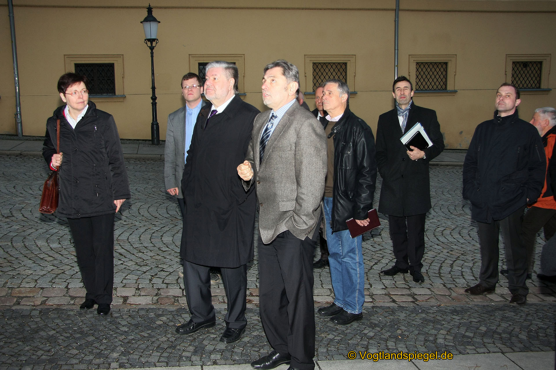Der rheinland-pfälzische Ministerpräsident Kurt Beck wird von Bürgermeister Gerd Grüner durch die Stadt Greiz geführt.