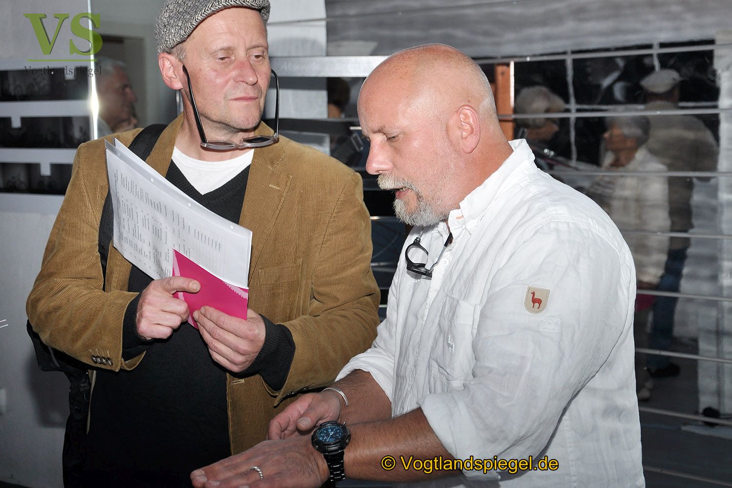 In der Greizer Bruno-Bergner-Straße findet eine temporäre Ausstellung mit Fotos und Poesie zu vergessenen Fahrrädern statt – Karsten Schaarschmidt (r.) und Frank Maibier im Gespräch