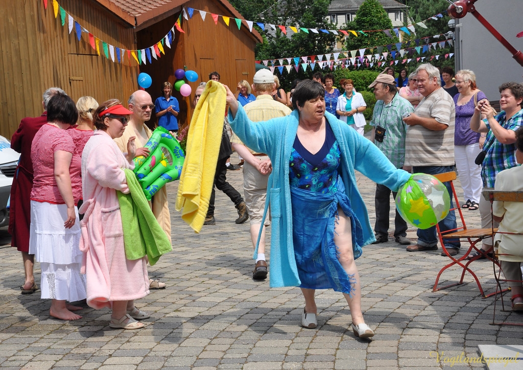 MOHLSDORF. „Das diesjährige Motto des Festes wurde rund um alle Freuden, die man mit Wasser in Verbindung bringt ausgewählt“, wie Beate Heimerl, 2. Vorstandsvorsitzende der Lebenshilfe e.V. sagte. Auch in diesem Jahr konnten die Bewohner wieder eine Vielzahl von Gästen aus nah und fern begrüßen – so die Freunde aus Sokolov, aber auch von befreundeten Vereinen aus Zeulenroda, Schleiz und dem Carolinenfeld. Eingeladen hatte man das Mode-und Showteam Greiz, das unter dem Beifall der Anwesenden bunte Sommer-und Bademode präsentierte. Auch Hausbewohner nahmen spontan an der Modenschau teil, was mit besonders herzlichem Applaus quittiert wurde. Bei Kaffee und Kuchen sowie Deftigem vom Grill war die gute Laune längst vorprogrammiert. Auch an die jüngsten Festbesucher wurde wie immer gedacht – ob beim Entenangeln, Basteln von bunten Blumensträußen, Schöpfen von „Edelsteinen“ aus einer Zinkbadewanne, Büchsenspritzen oder dem Torwandschießen. Die Außenwohngruppe hatte sich damit beschäftigt, aus Holunder Gelee herzustellen, den sie auch zum Kauf anbot. Für die musikalische Unterhaltung sorgte in bewährter Weise die Disco „Musikbasar“ mit Matthias Pohle, der die Gäste mit flotten Rhythmen, wie dem Knallroten Gummiboot versorgte.