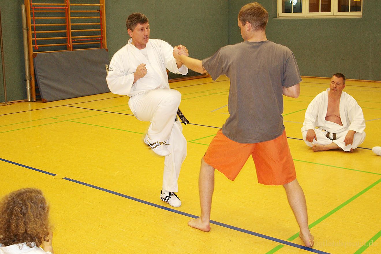 Auch Kickboxen wird beim 1. Greizer Karate Dojo e.V. betrieben. Hier Christoph Limbacher ( links ) bei der Trainingsanleitung, Dr. Lutz Winkler ( sitzend/rechts ). Foto: Peter Reichardt