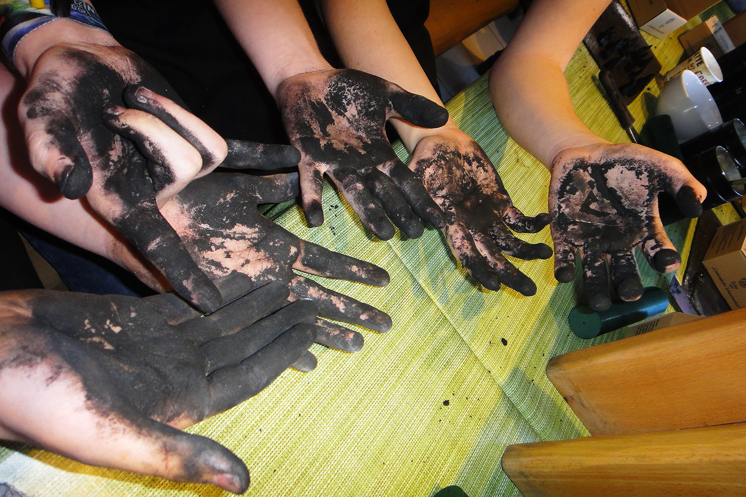 Die Hände sehen nach dem Fertigen der Räucherkerzen natürlich dreckig aus.