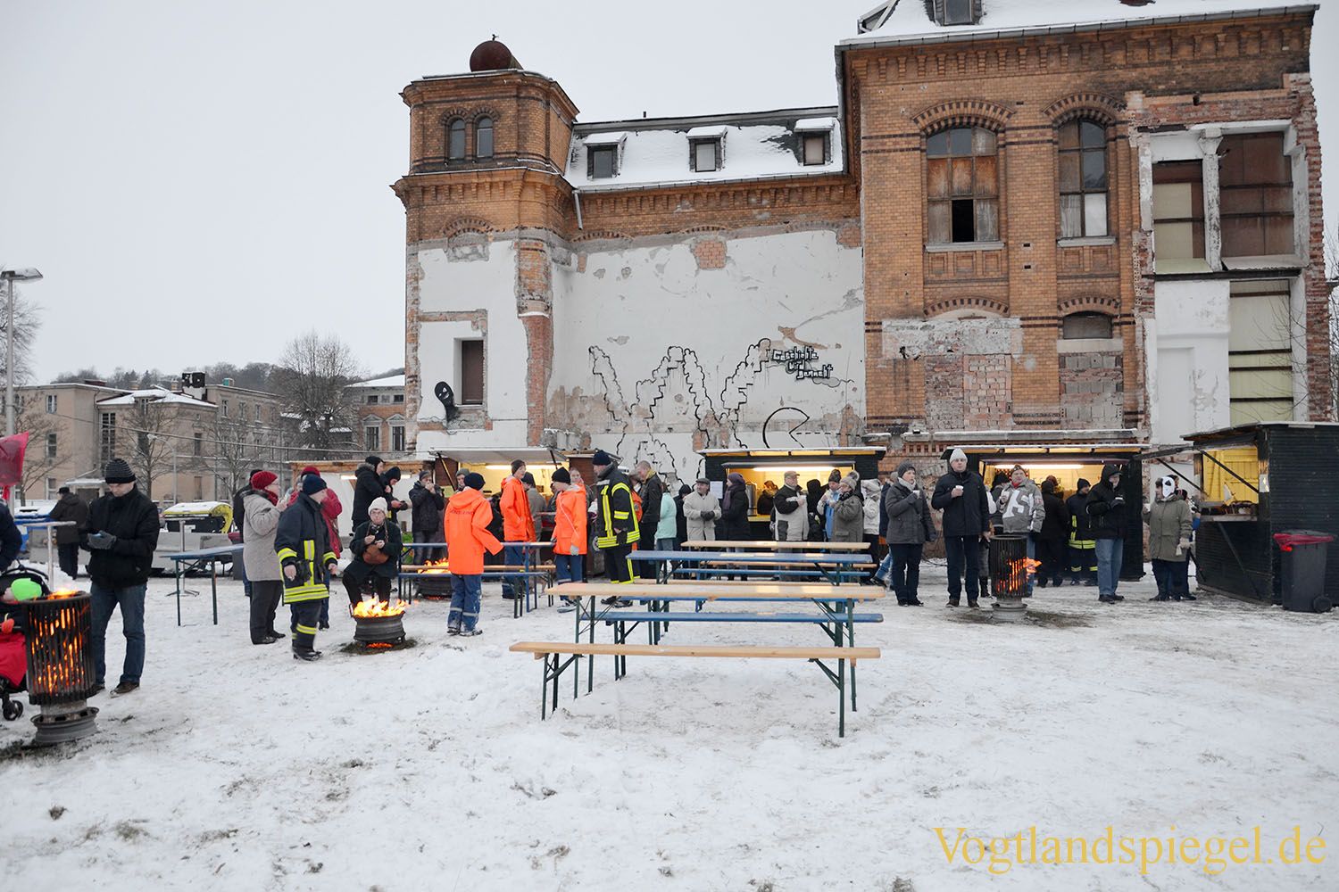 Trotz eisigen Wetters kommen die Leute zum Tannenbaumverbrennen.