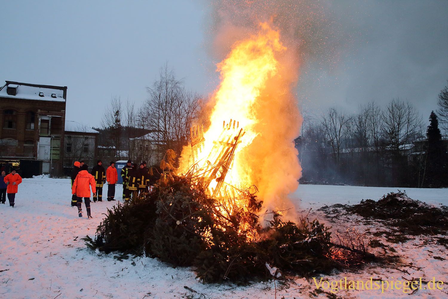 Viele Kameraden sind bemüht, die Tannenbäume in die Flammen zu werfen. Hell lodert das Feuer.