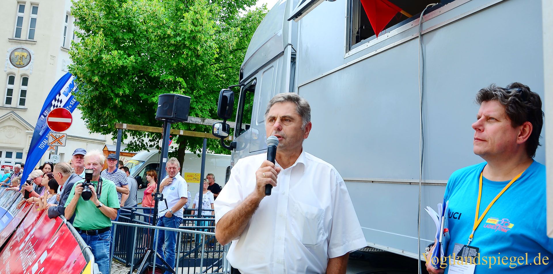 Bürgermeister Gerd Grüner bei seinem Grußwort an die Fahrerinnen.