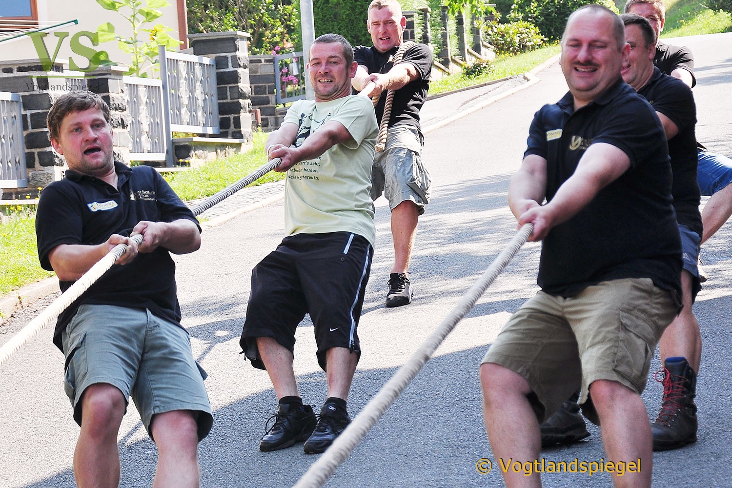 Die Männer-WG Langenwetzendorf belegte beim traditionellen Traktorenziehen in Nitschareuth den 1. Platz – hier während des Wettkampfs das Team Schleuße