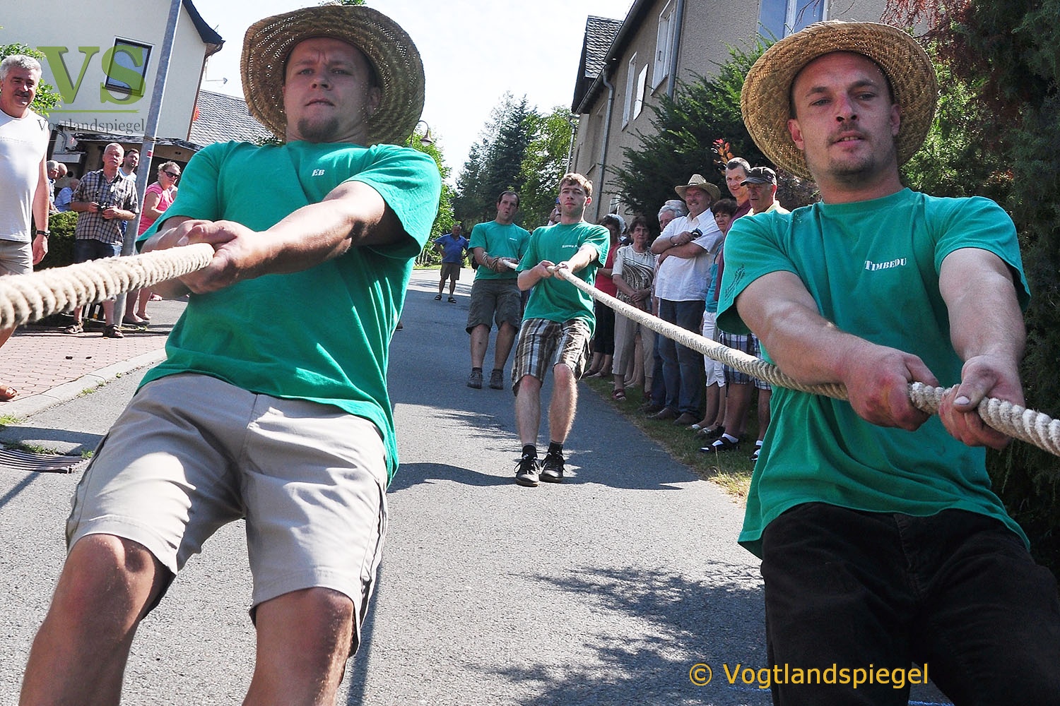 Die Männer-WG Langenwetzendorf belegte beim traditionellen Traktorenziehen in Nitschareuth den 1. Platz – hier während des Wettkampfes: größte Anstrengung