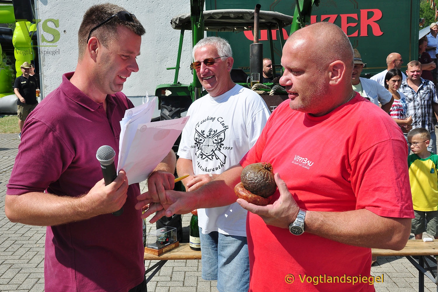 Die Männer-WG Langenwetzendorf belegte beim traditionellen Traktorenziehen in Nitschareuth den 1. Platz – Ortsteilbürgermeister Jörg Limmer nimmt die Ehrung vor