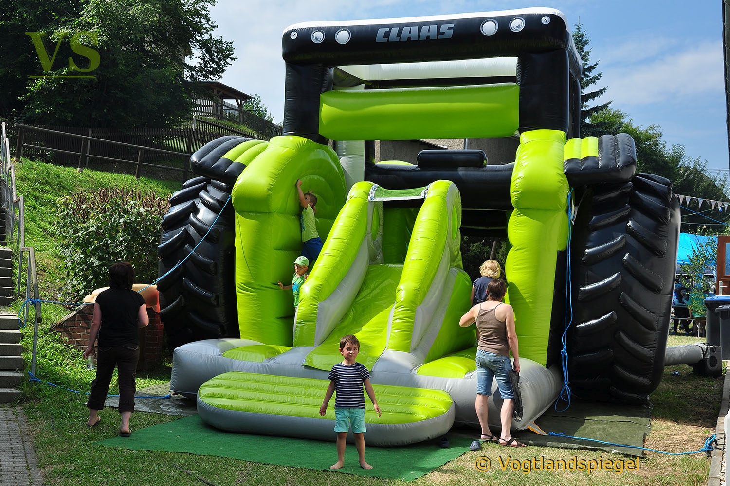 Die Männer-WG Langenwetzendorf belegte beim traditionellen Traktorenziehen in Nitschareuth den 1. Platz – hier die große Hüpfburg