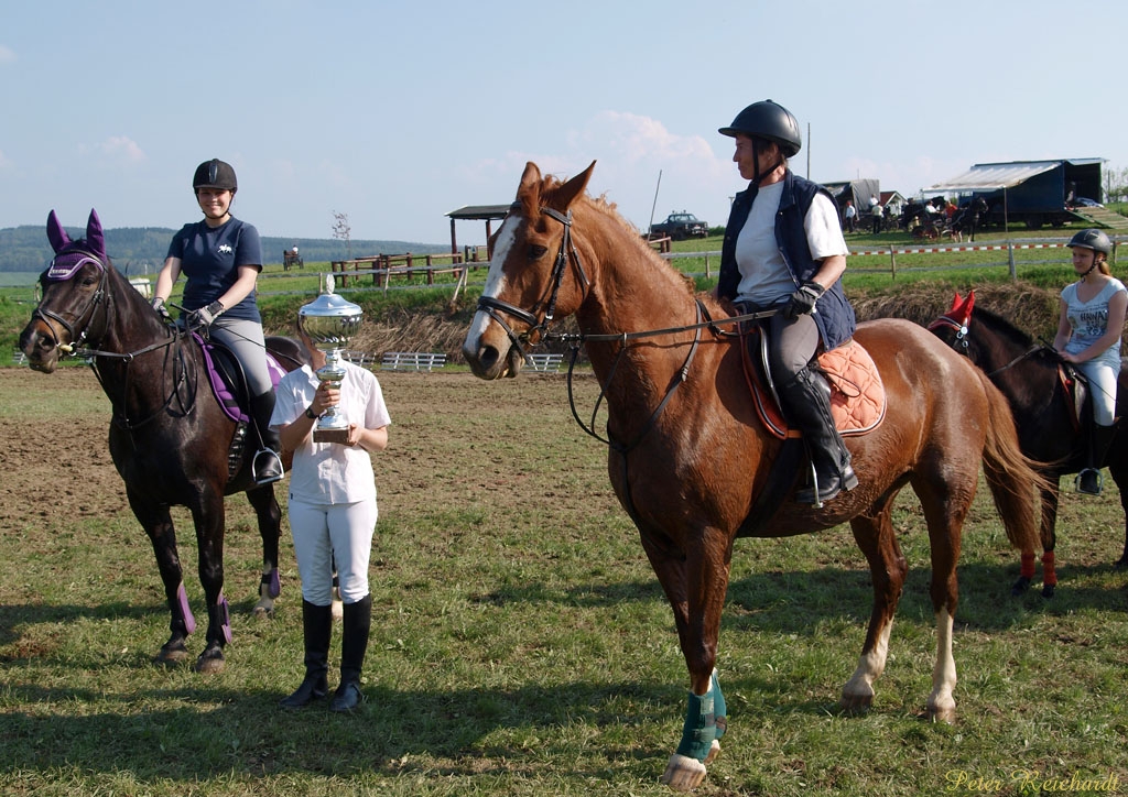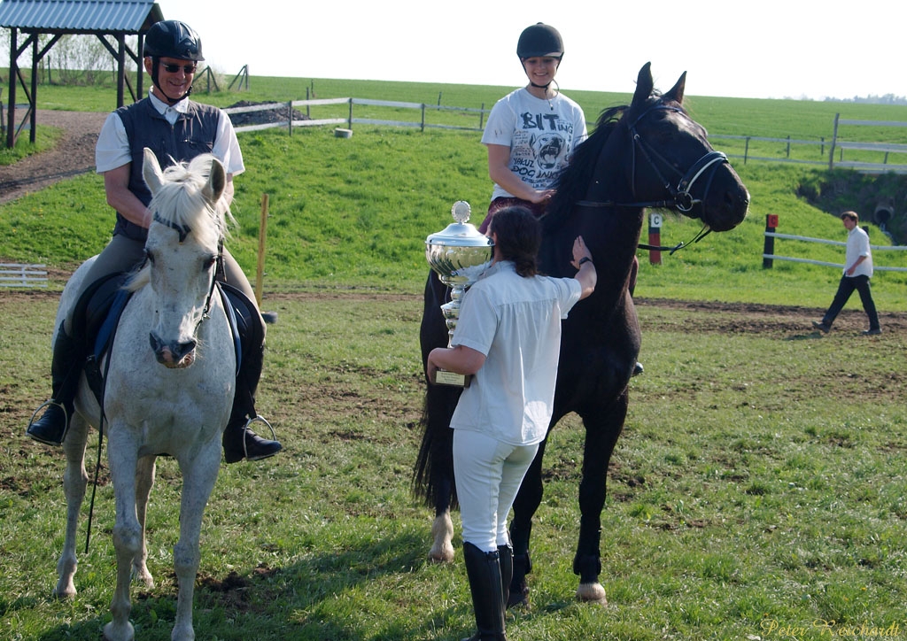 Großer Gaudi als der große Hengstvierspänner zum Staffelrennen angekündigt wurde. Jana Schaller hatte Christian Weiß, Robert Jäschke, Michel Lott und Christian Schönberger ( alles Mitglieder des RFV Mohlsdorf ) vor die Kutsche gespannt und jagte sie mit Peitschenhieben über den Kegelparcours. Riesenjubel bei den Zuschauern auf den Traversen, als nach dem Zieleinlauf die Hengste wild wurden, die Fahrerin Jana Schaller sich schnappten und diese in der schnell durch Hubert Jäschke herbei gefahrenen Badewanne abkühlten. Nass war es auf jeden Fall! Die jungen Reiterinnen des RFV Mohlsdorf zeigten mit ihren Ponys eine Springquadrille, die es in sich hatte. Wurde doch im Takt miteinander, gegeneinander sowie über Kreuz mit den vier Pferden gesprungen. Natürlich gab es auch das berühmte Stuhlreiten, das Melanie Sewina nach einigen Hindernissen für sich entscheiden konnte. Eleganz und Ausstrahlungskraft bewiesen die sechs Reiterinnen und Reiter der Dressurquadrille hoch zu Ross unter der Führung von Doreen Kreim, die mit ihren exakten Wendungen, Linienführungen und kreuzenden Durchläufen die Zuschauer auf den Traversen begeisterten. Doch dann wurde es noch einmal rasant. Es wurde zum Staffelreitwettbewerb um den Wanderpokal Bester Verein auf der Hindernisbahn aufgerufen. Vom Start über die ungarische Brücke, über zwei Springhindernisse mit engem Wendekreis, durch den Wassergraben und Onkel Tom’s Hütte, zum Hoch-Steilsprung, die Schlangenlinie bis zum Ziel ging es rund 800 Meter, um dort abzuschlagen bzw. den Zieleinlauf zu markieren. Drei Starter mussten die Strecke bewältigen, wobei der Verteidiger des Wanderpokals der Reitverein Fraureuth war. Ein spannendes Staffelrennen, hatte es doch den Charakter einer Military, das in der Endkonsequenz die Staffel des Reitvereins Fraureuth erneut gewann und den Wanderpokal wieder mitnehmen konnte. Für Fraureuth ritten Petra Fuchs mit Lord ( sie absolvierte zwei Umläufe ) und Kristin Michel mit Amelie. Was den Reitern recht, das war den Gespannfahrern an diesem Nachmittag billig. Sie fuhren das Staffelrennen um die goldene Badewanne aus. Jana Schaller hatte sie ja schon im übertragenen Sinn am Nachmittag genossen. Hier war es die Erfahrung und Cleverness von Hubert Jäschke, der Ebano vorgespannt hatte, die ihn zum Sieg und den Pokal ( ein silbernes Reitpferd ) führten. Ihm folgten Jana Schaller mit Erwin an den Leinen sowie Janine Hielscher, die ihre beiden Ponys Lilly und Christel eingespannt hatte, auf den Plätzen.