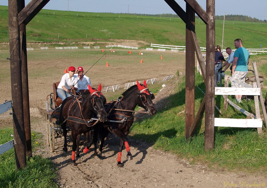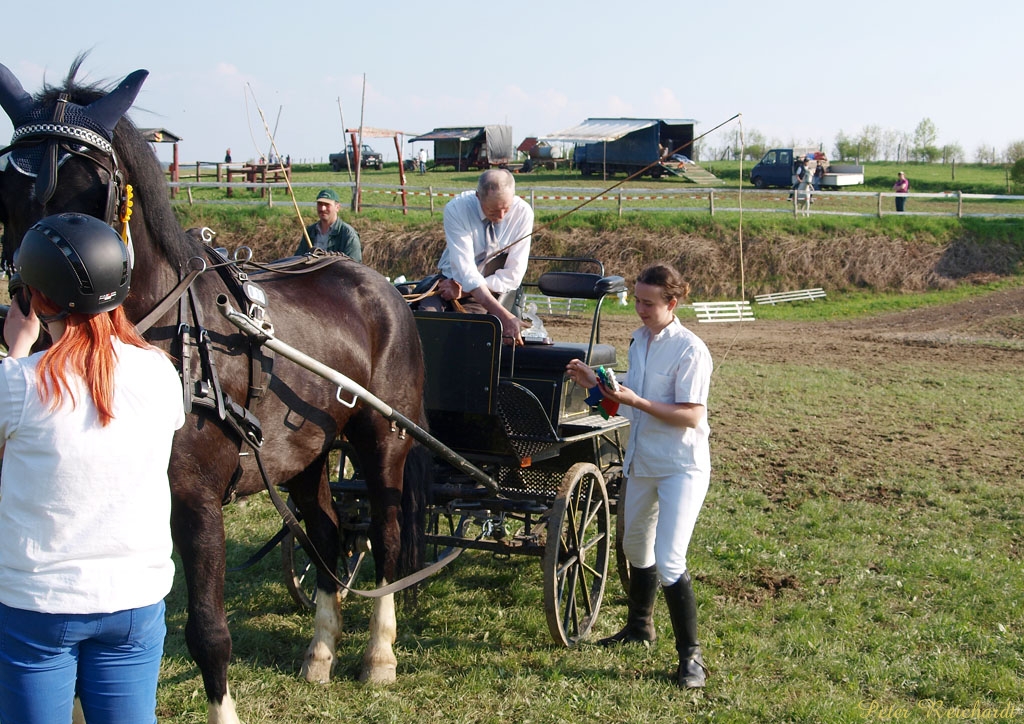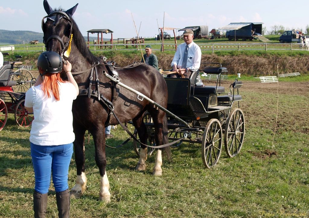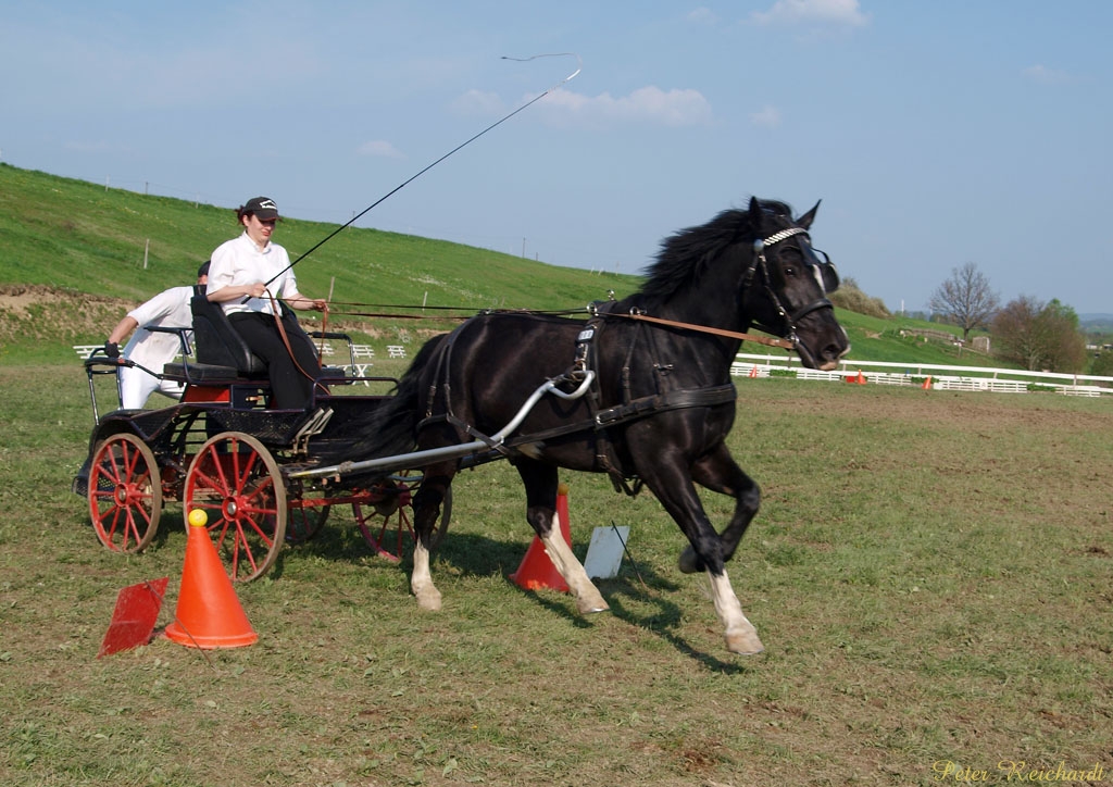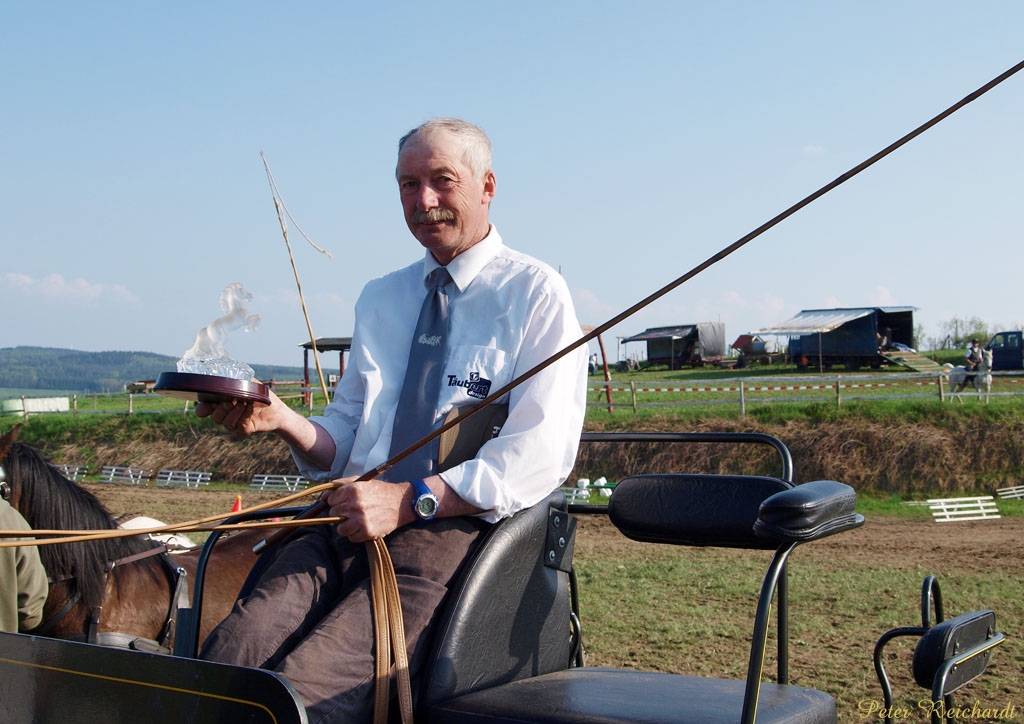 MOHLSDORF. Endlich ein Tag, wie man sich diesen in reiterlichen Kreisen wünscht und der dem Namen Mohlsdorfer Pferdefrühling am vergangenen Sonntag, den 5. Mai alle Ehre machte. Ein kleines Volksfest wurde es, und das bei strahlendem Sonnenschein; hatten sich doch viele Besucher auf den Traversen des Reit- und Fahrparcours Am Ziegengraben eingefunden und verfolgten interessiert die pferdesportlichen Vorführungen und Wettkämpfe der Pferdesportler des RFV Mohlsdorf und seiner Gäste. Ein pferdesportliches Event, das die ganze Breite der pferdesportlichen Aktivitäten aufzeigte und mit viel Beifall belohnt wurde. Natürlich war da auch manch Gaudi dabei, was die Zuschauer mit Lachen sowie Heiterkeit quittierten und das Programm an diesem Nachmittag noch bunter machte. Erst der Glockenklang von der Hermannsgrüner Kirche und dann die Eröffnungsfanfare dieser Show, dazu herrliches Frühlingswetter bei angenehmen Temperaturen – es passte alles zusammen. Schon das erste Bild- eine Freude für die Pferdesportfreunde. Zeigte es doch sehr unterschiedliche Anspannungen vor Kutsche und Wagen, angefangen beim rassigen Vierspänner mit Hubert Jäschke an den Leinen, den Zwei- und Einspännern, dem Kremser mit seiner gemütlichen Fahrt bis hin zu der ganz selten gesehenen englischen Tandemeinspannung ( zwei Pferde hintereinander )am Jagdwagen, gefahren von Detlef Rahnfeld. Doch auch Western-Reiter und die Andalusische Reitschule waren mit von der Partie und zeigten die Rassigkeit des Pferdesports. Das wurde unterstrichen von Andrea Kögler vom PSV Merkendorf, die auf Erasmus eine Dressur der Klasse S ganz ausgezeichnet ritt und die Zuschauer immer wieder mit der Exaktheit der Figuren, der Akkuratesse der Schrittfolgen sowie Schrittwechseln verblüffte und zu viel Beifall animierte. Fußballspielen ist eine Massensportart, doch dass das auch Pferde können, das bewiesen die Mohlsdorfer Reiterinnen. Pony gegen Großpferd hieß die Begegnung von jeweils drei Pferden in jeder Mannschaft, das die Ponys mit 1:0 für sich entschieden. Rasant ging es dabei zu und Pferdebeherrschung war gefragt. Die folgende Einspänner-Quadrille zeigte die Eleganz des Dressurfahrens. Sechs Einspänner mit der Vereinsbeflaggung auf dem Parcours und das exakt in Dressur- und Fahraufgabe – eine Augenweide für die anwesenden Pferdesportfreunde, unter denen sich auch viele Kenner der Szene befanden. Ein Highlight dieses Mohlsdorfer Pferdefrühlings war die kombinierte Staffel von Einspänner und Trabant, wobei dem feuerroten PKW das Team Die Spinne ( sie fahren beim Trabi-Rennen in Pausa mit ) freundlicherweise zur Verfügung stellten. Schnellste war hier Janine Hielscher mit ihrem Pony-Zweispänner auf dem Marathonwagen und Robert Jäschke im Trabant.
