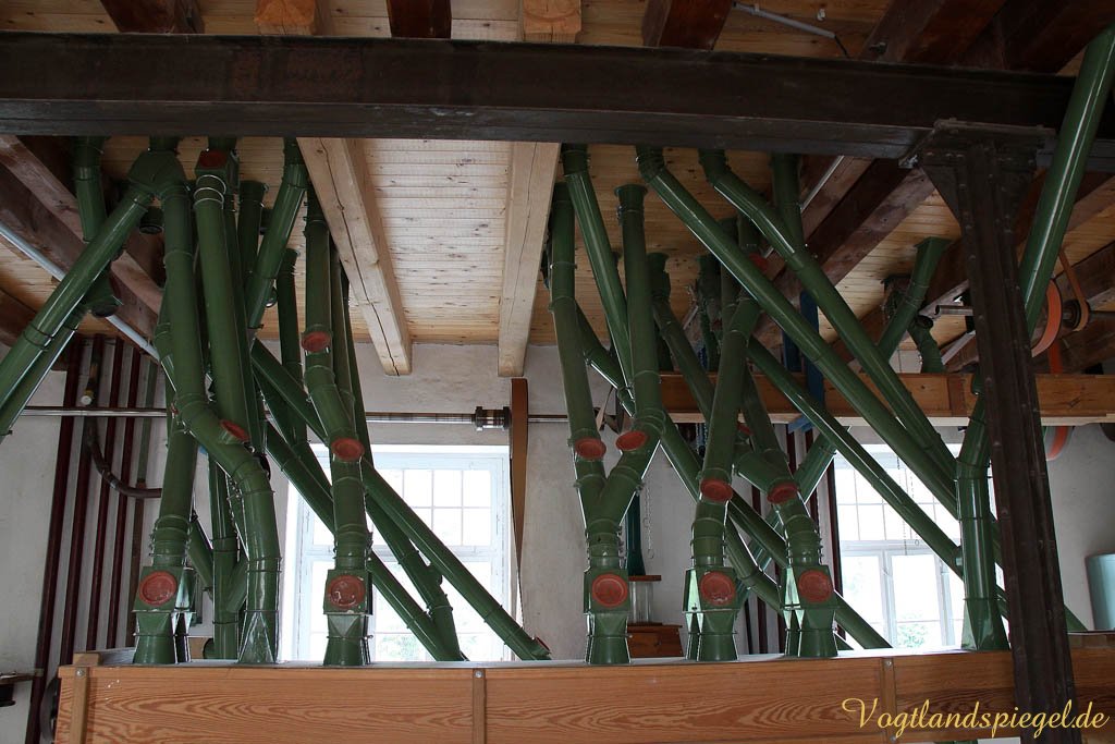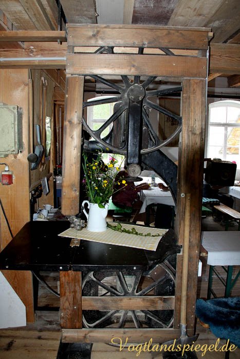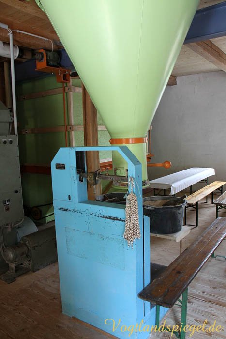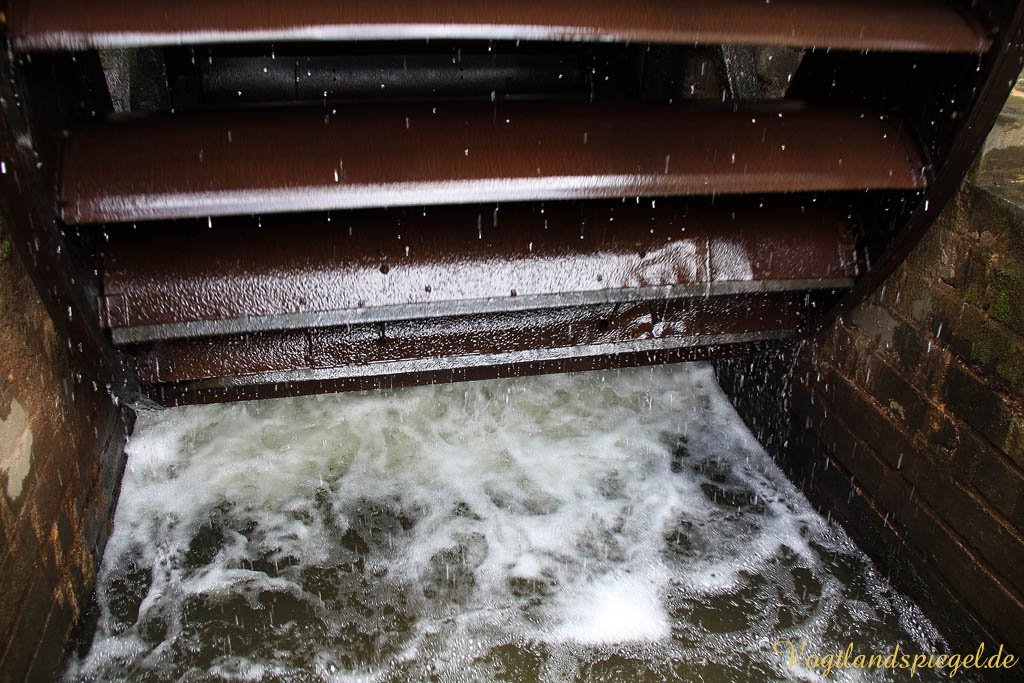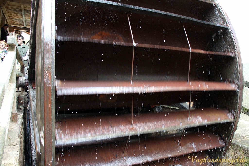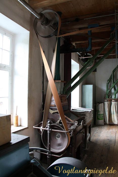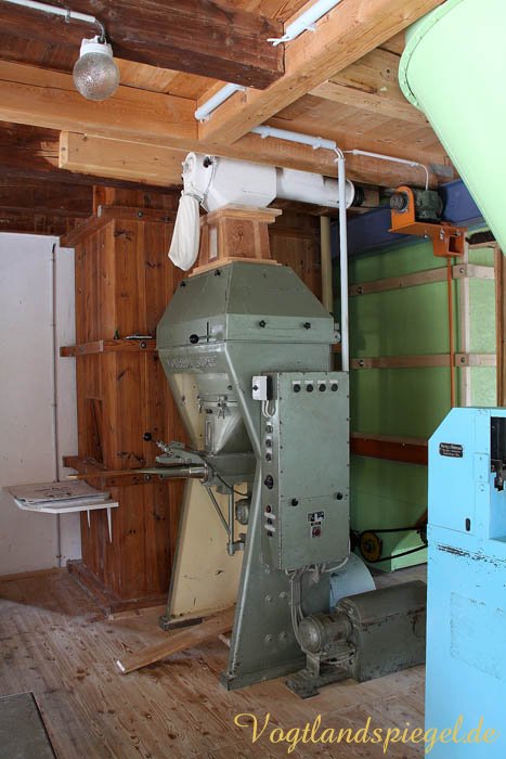 GREIZ-NEUMÜHLE. Gebaut wurde die Wassermühle im Jahr 1347. Das alte Wasserrad leistete etwa 12 PS. 1979 wurde eine Wasserturbine mit einer Leistung von 100 PS in Betrieb genommen. Zum Mühlentag 1997 wurde das neue Wasserrad mit 200 PS Leistung in Betrieb genommen. Die Mühle dient als Getreidemühle mit angeschlossenem Sägewerk.