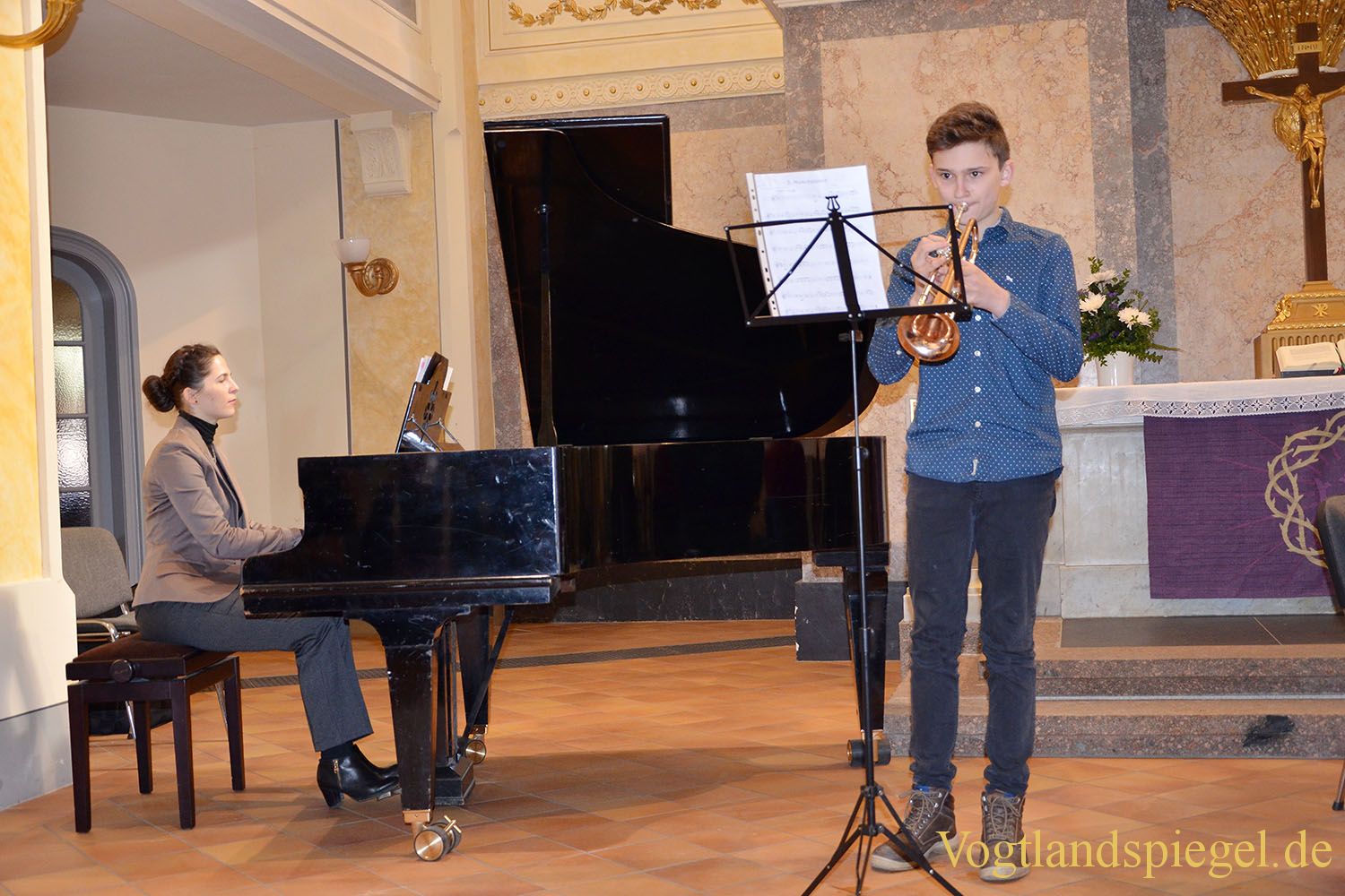 Luca Haußdorf spielt auf der Trompete, begleitet von Anita Rott am Klavier.