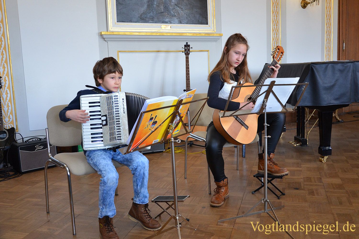Jenny Stieben (Gitarre) und Bruder Danny (Akkordeon) spielen das Stück „Jetzt wird’s flott“.