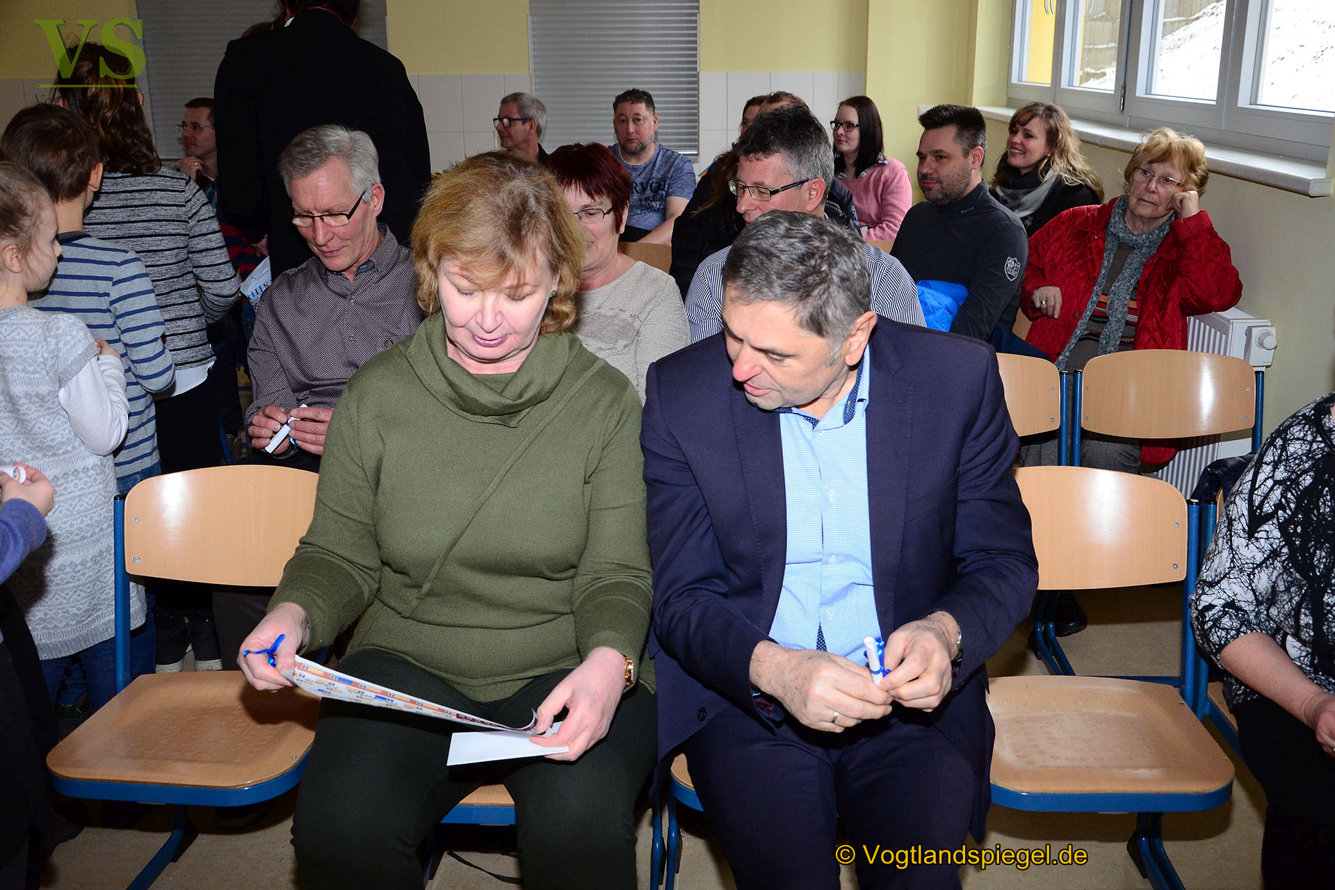 Die Grundschüler überreichen den Gästen eine kleine Rolle.
