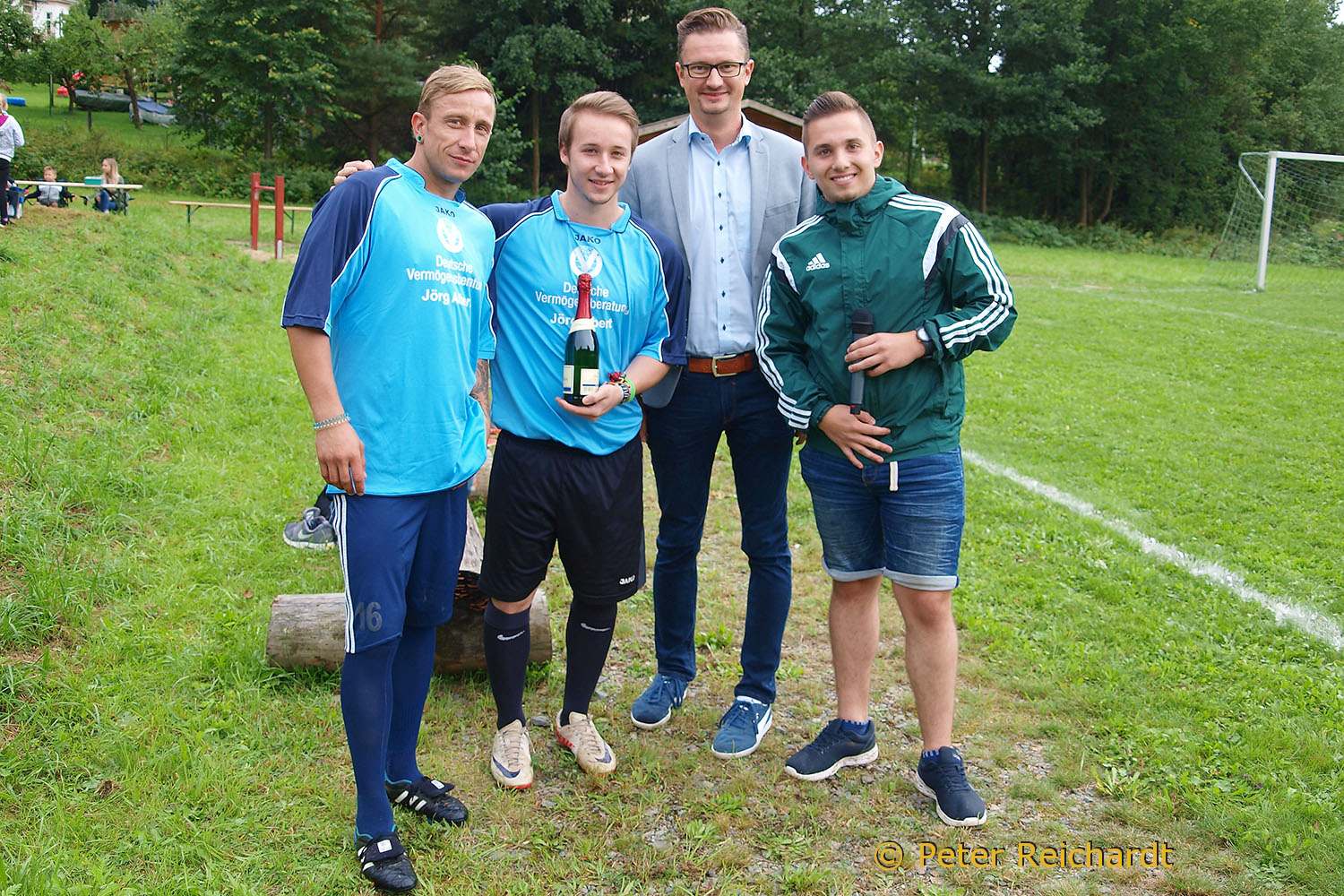 Steven Lenzner und Tobias Arnold nahmen die Glückwünsche zum Deutschen Meister 2017 der Deutschen Soccer-Liga von Christian Tischner und Maurice Wünsch entgegen. ( von links )