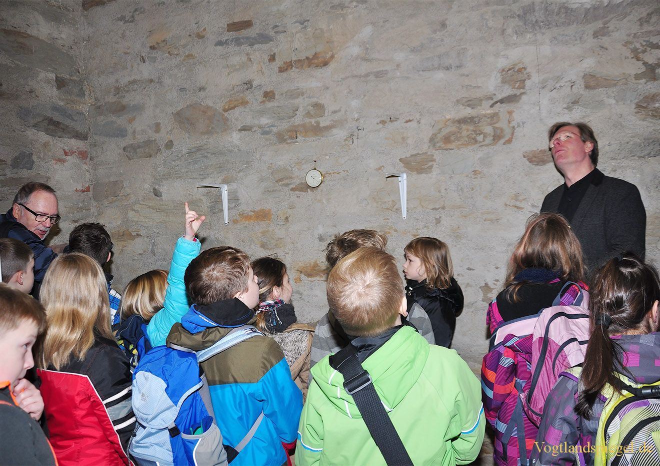 Interessiert schauen die Kinder die Kellerräume an.
