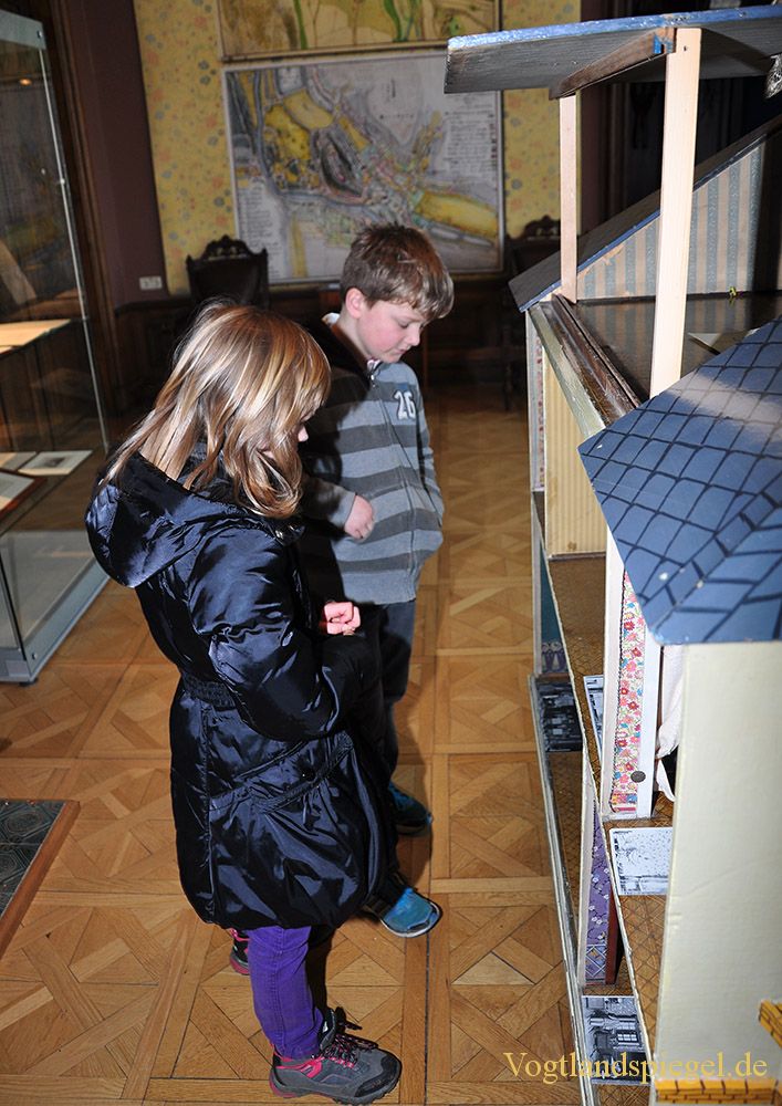 Interessiert schauen die Schüler das große Puppenhaus an.