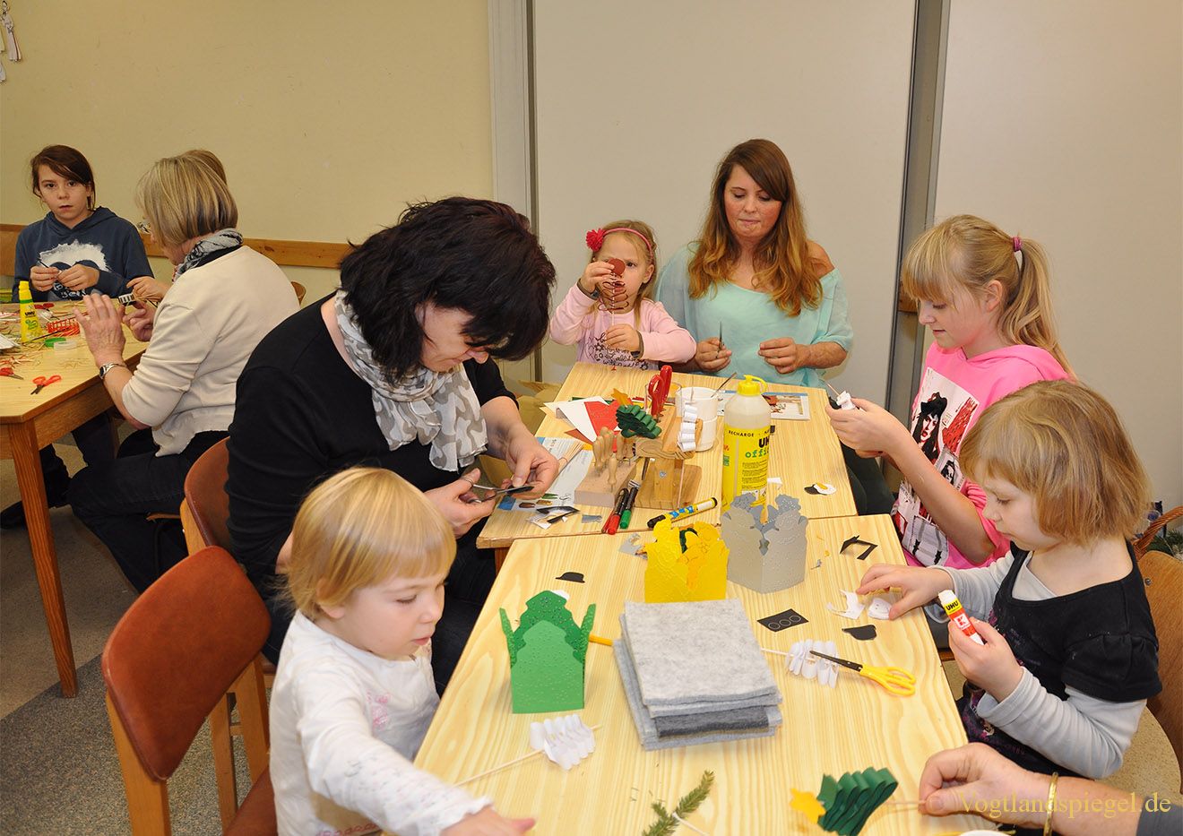 An diesem Tisch wird fleißig ausgeschnitten, gefalzt und geklebt.