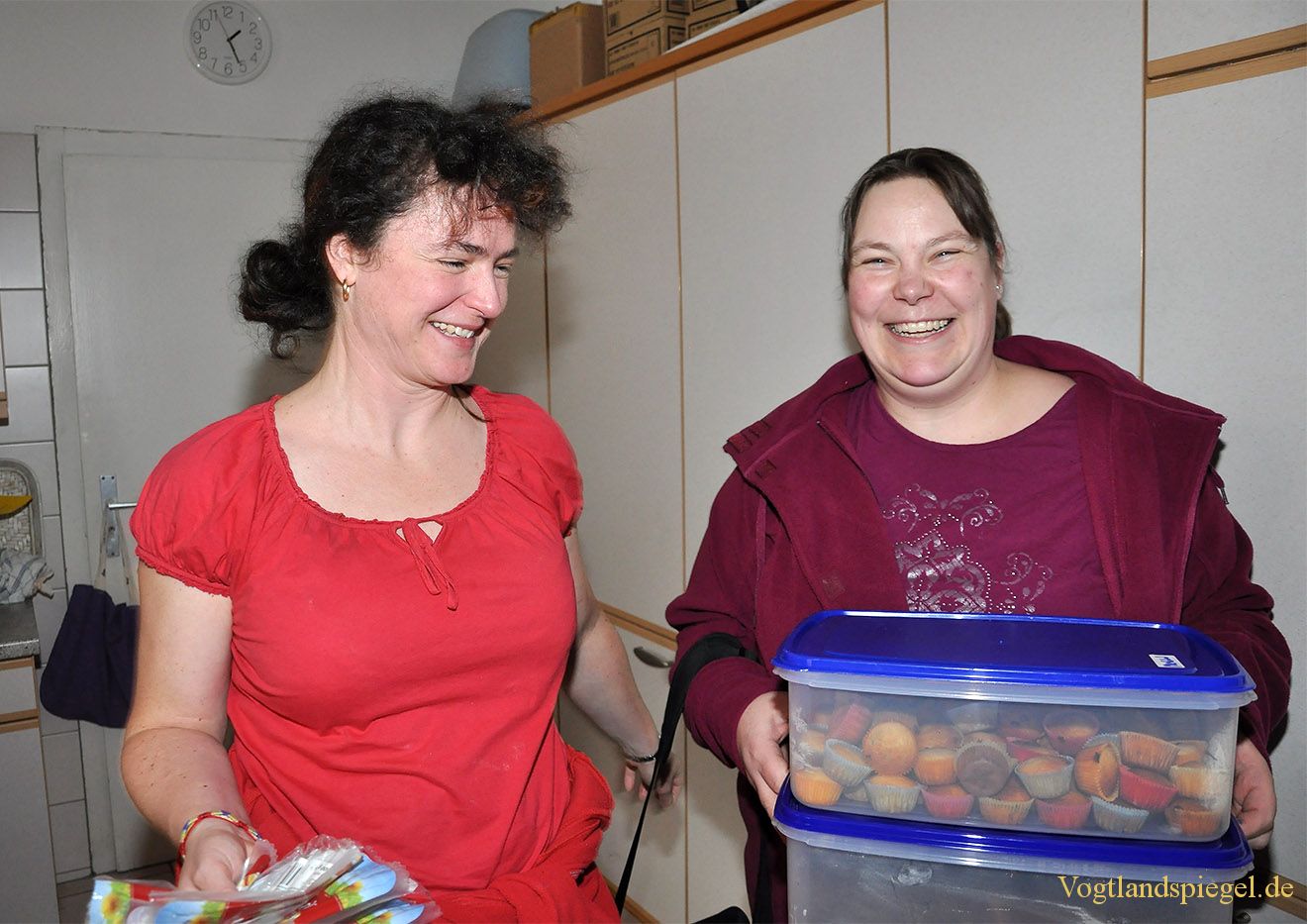 Kerstin Czwienczek (l.) freut sich riesig über die beiden Dosen mit Muffins, die eine Mutti für die Kinder gebacken hat.