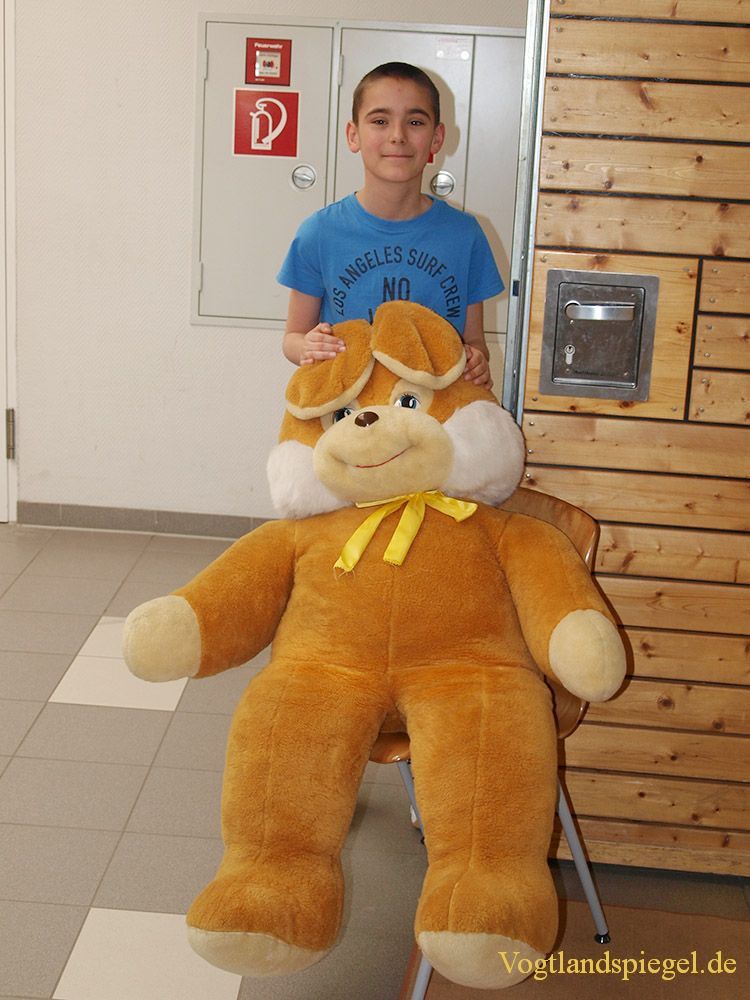 Ein großer Plüschhase am Eingang lädt zum Streicheln ein.