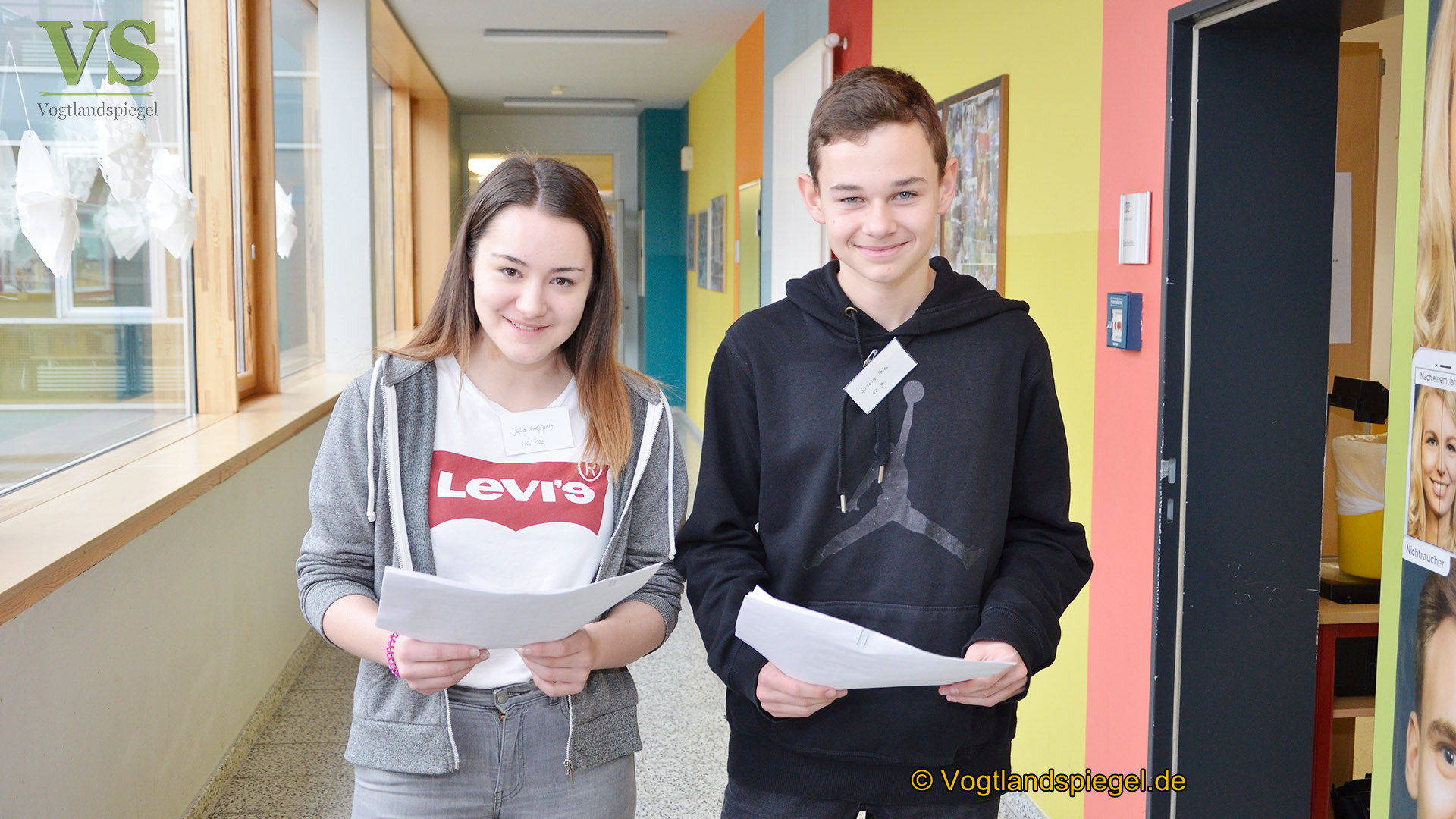 Die Schülersprecherin der Regelschule Greiz-Pohlitz, Julia Gebhardt, mit Schülerlotse Sascha Thiel.