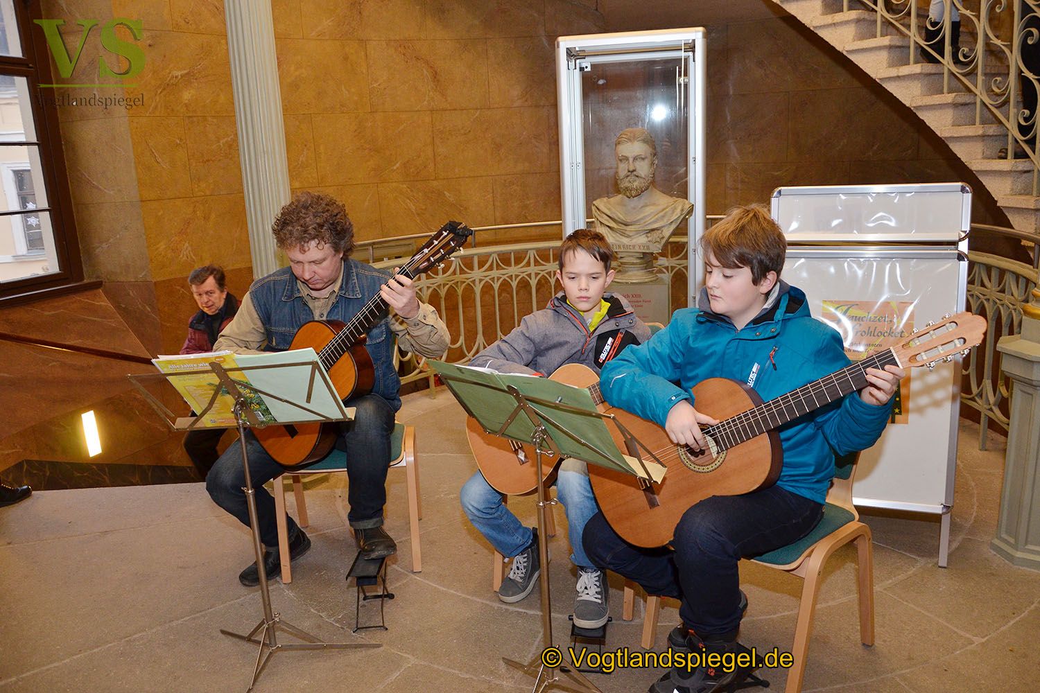 Gitarrenlehrer Ronny Kerl mit zwei Schülern bei weihnachtlichen Klängen im Treppenaufgang.