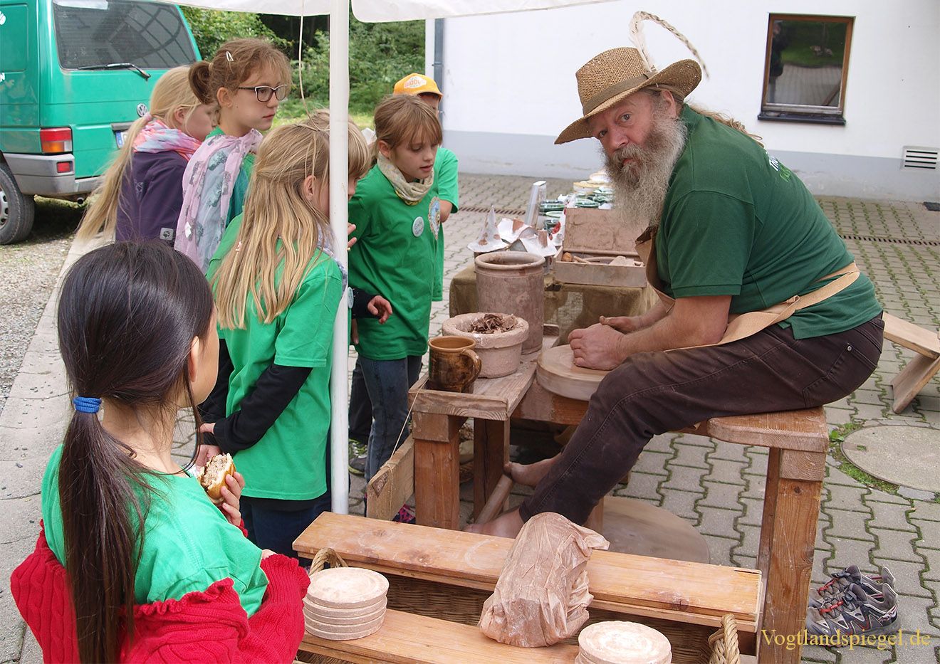 Ralf Naundorf, so wie man ihn kennt, zeigt Kindern sein Töpferhandwerk.