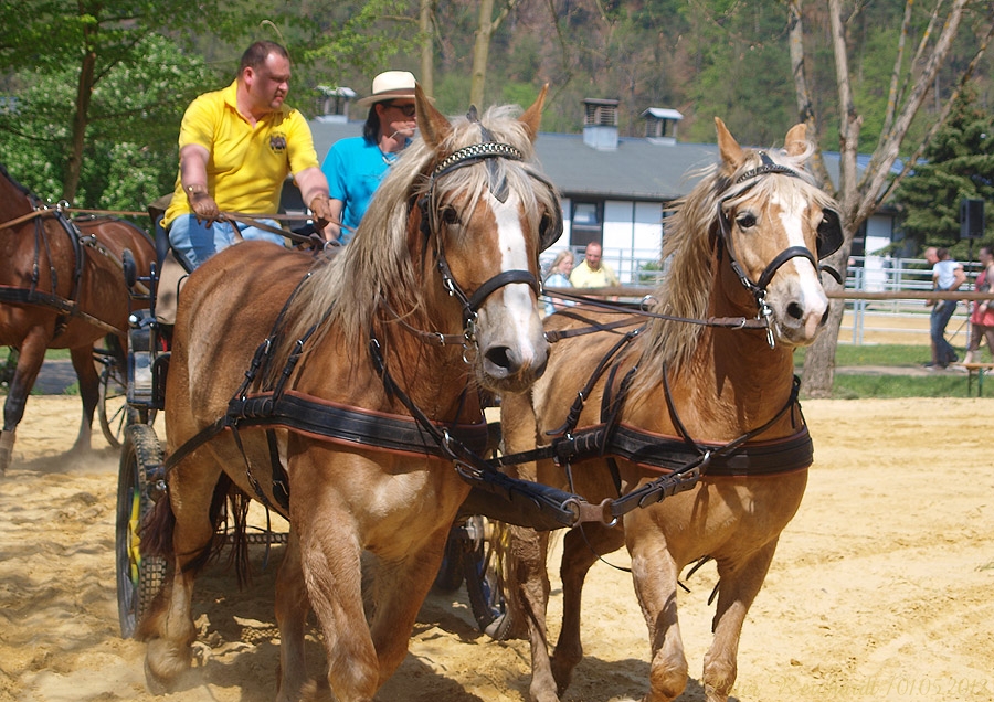 Einer der Höhepunkte des Programms waren die beiden schwarzen Perlen aus dem Elstertal. Bettina Winkler hatte »Amazone« und Carolin Sagan »Interflug« vor die Einspänner gespannt und zeigten mit ihnen an den Leinen zur Musik von Robby Bauer einen sehenswerten Figurenreigen auf dem Platz.