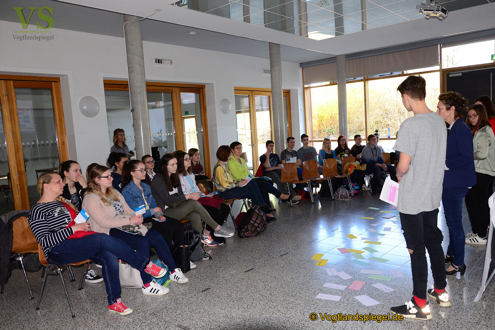 Thüringens Finanzministerin Heike Taubert (M.) hatte vor den Neuntklässlern der Pohlitzer Regelschule einen Vortrag gehalten.