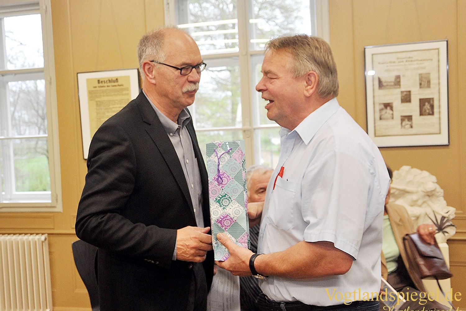 Jürgen Frantz hat für jedes Vorstandsmitglied noch ein kleines Präsent mitgebracht – hier für Stephan Seiffert
