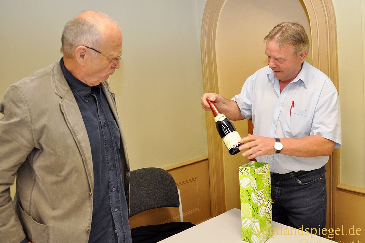 Jürgen Frantz hat für jedes Vorstandsmitglied noch ein kleines Präsent mitgebracht -hier für Wilfried Pucher