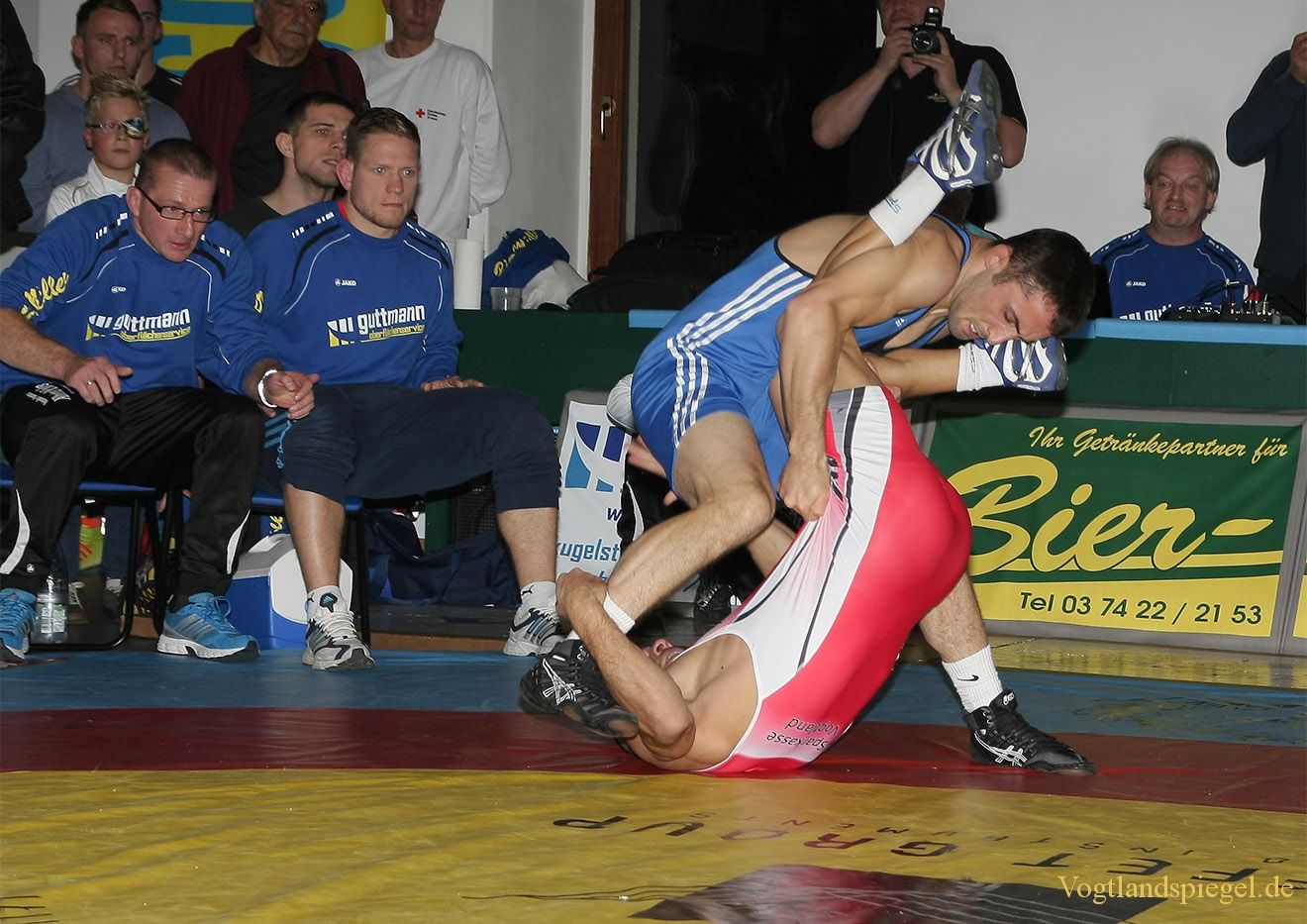 Weltklasse von Vladimir Gotisan Wird der Markneukirchner Boycho Boychov (rotes Trikot) nicht doch von Vladimir Gotisan geschultert? Die Trainer des Gastgebers Andy Schubert (links) und Björn Hauck schauen entsetzt zu.