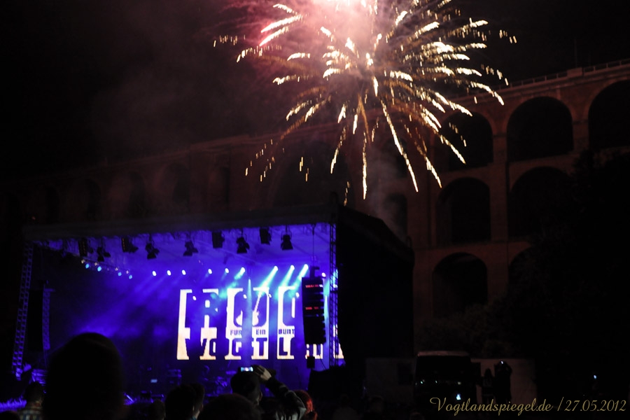 MYLAU-GÖLTSCHTALBRÜCKE. Zum dritten Mal seit 2009 wurde das Gelände an der Göltzschtalbrücke am Pfingstsonntag zum Austragungsort des Festivals „Rock für ein buntes Vogtland“, das für Vielfalt und Toleranz und gegen Rechtsextremismus steht. Im Jahr 2008 hatten Daniel Kertscher und Andreas Böttcher die Idee, ein solches Spektakel zu inszenieren, da man „mit Musik die Jugend erreichen kann“. Der Ort sei dabei ebenso symbolträchtig, weil die Göltzschtalbrücke genau zwischen Thüringen und Sachsen steht und man damit nicht nur sinnbildlich „Grenzen aufbrechen“ könne. Seit 2010 ist das Festival in den Plauener Verein Vivere e.V. integriert. Unterstützung fanden die Organisatoren beispielsweise beim Landratsamt Vogtlandkreis, den Städten Plauen und Greiz, dem Verein The.ARTer, dem VVN (Vereinigung der Verfolgten des Naziregimes),dem Bunten Bündnis und dem Jugendamt Greiz, aber auch vielen ehrenamtlichen Helfern, die man gut an den orangefarbenen T-Shirts erkennen konnte, ebenso dem DRK, das vor Ort war. Vor allem den Familien war der Nachmittag gewidmet: Sumoringen oder Kinderschminken gefiel natürlich den Jüngsten besonders. Musikalisch kamen die Schülerbands „Connection error“ von der Reichenbacher Musikschule oder Psychic Badass aus Mylau zum Zug. Das Abendprogramm wurde von der Chemnitzer Band Panos eröffnet. Grün kostümiert und mit grotesken Masken boten sie bereits optisch einen schrillen Eindruck. Balalaika BigBang nennen sie selbst ihren Musikstil, den man auch mit Katastrofje bezeichnen kann. Look at this ist einer der Titel, den die Außerirdischen zelebrierten. Hip Hop stand danach auf dem Programm: Die Tacheles Combo, Gewinner des Bandcontests vor zwei Jahren konnten diesmal ihren Gewinn einen Auftritt beim Festival einlösen. Extra für Rock für ein buntes Vogtland hatten die Musiker einen Titel komponiert. Ihr Ruf ins Publikum, Gesicht gegen Rechts zu zeigen und die Hände zu heben, blieb allerdings fast ungehört. Die drei Freischwinger aus Nürnberg folgten mit Rock und deutschen Texten, bevor das Höhenfeuerwerk über der Göltzschtalbrücke seine Farbenpracht entfaltete. Die Rocker von Lauter Leben aus Köln kamen anschließend zu Gehör, den Abschluss des musikalischen Events bildete die tschechische Band Spankers, die zwar verspätet aber dennoch anreiste. Ska/Funk/Raggae-Klänge ließen auch die letzten Tanzmuffel aufgeben. Insgesamt eine mit viel Motivation und Fleiß organisierte Veranstaltung, die allerdings oft den roten Faden verlor. Lange Umbaupausen und Soundchecks ließen die gerade gewonnen Stimmung unter den Gästen verebben. Schade, dass man aus den vergangenen Jahren daraus nichts lernte.