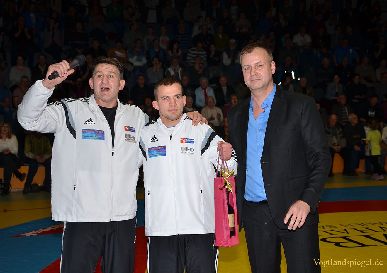 RSV-Präsident Thomas Fähndrich (r.) und Trainer Tino Hempel (l.) verabschieden Adam Sobieraj bei seinem letzten Kampf für Greiz.