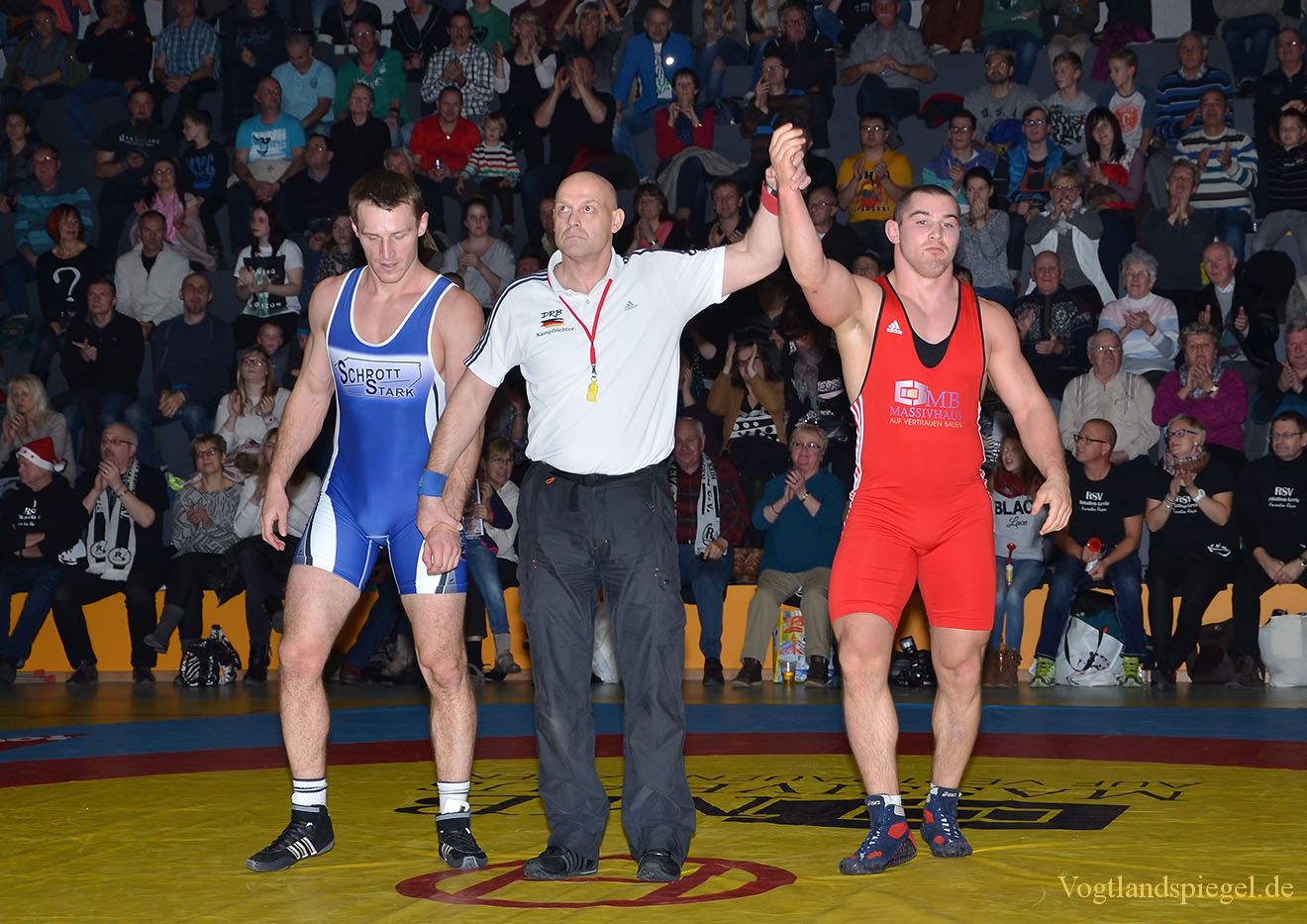 Marian Mihalik, AV Germania Markneukirchen, Kampfrichter Peter Pippel und Sieger Lukasz Konera (rotes Trikot), RSV Rotation Greiz