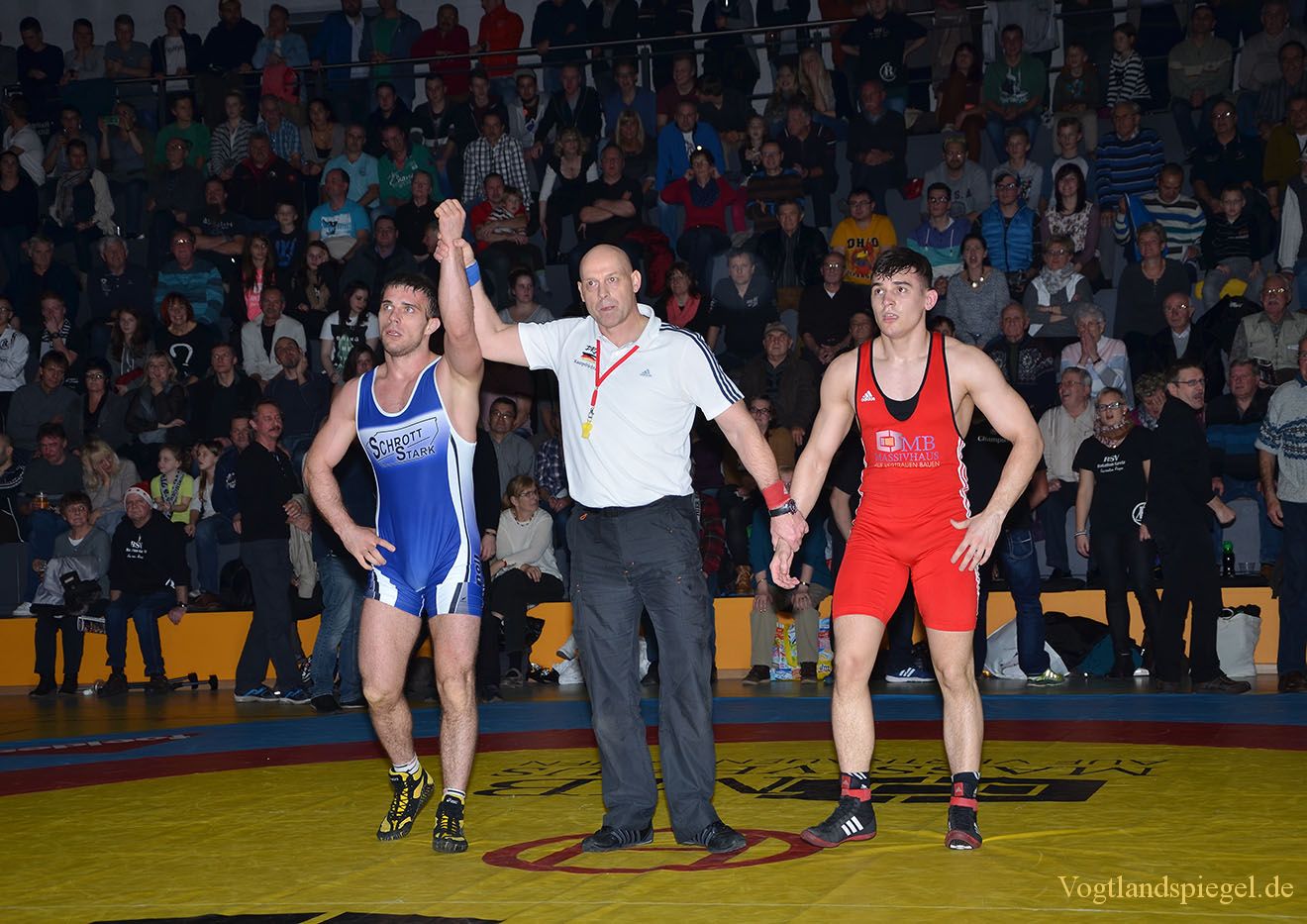 Sieger Andrzej Grzelak, AV Germania Markneukirchen, Kampfrichter Peter Pippel und Daniel Sartakov (rotes Trikot), RSV Rotation Greiz