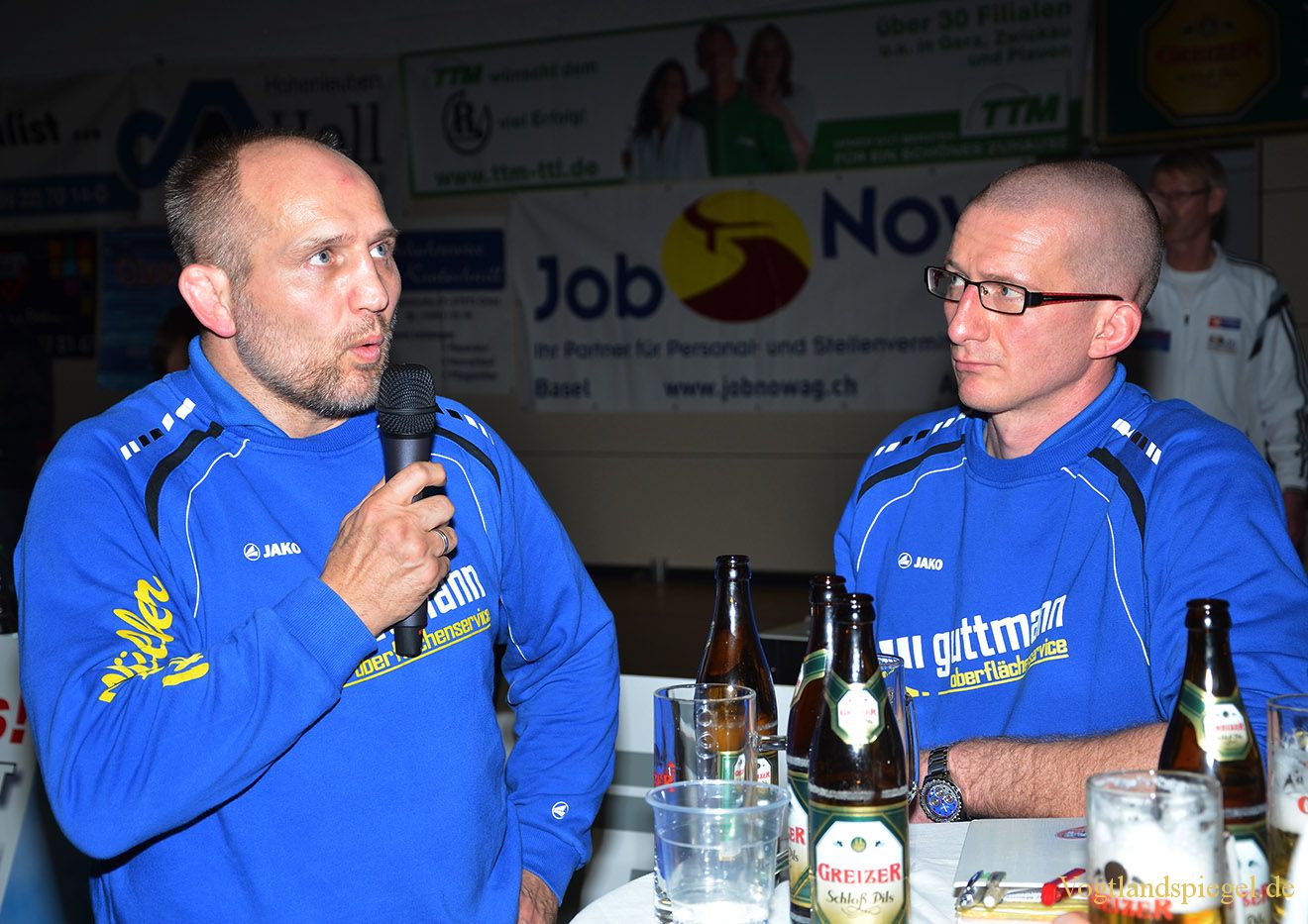 André Backhaus (l.) und Markneukirchen-Trainer Andy Schubert zur Pressekonferenz.
