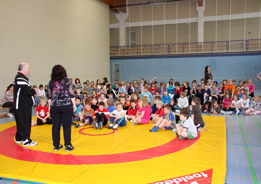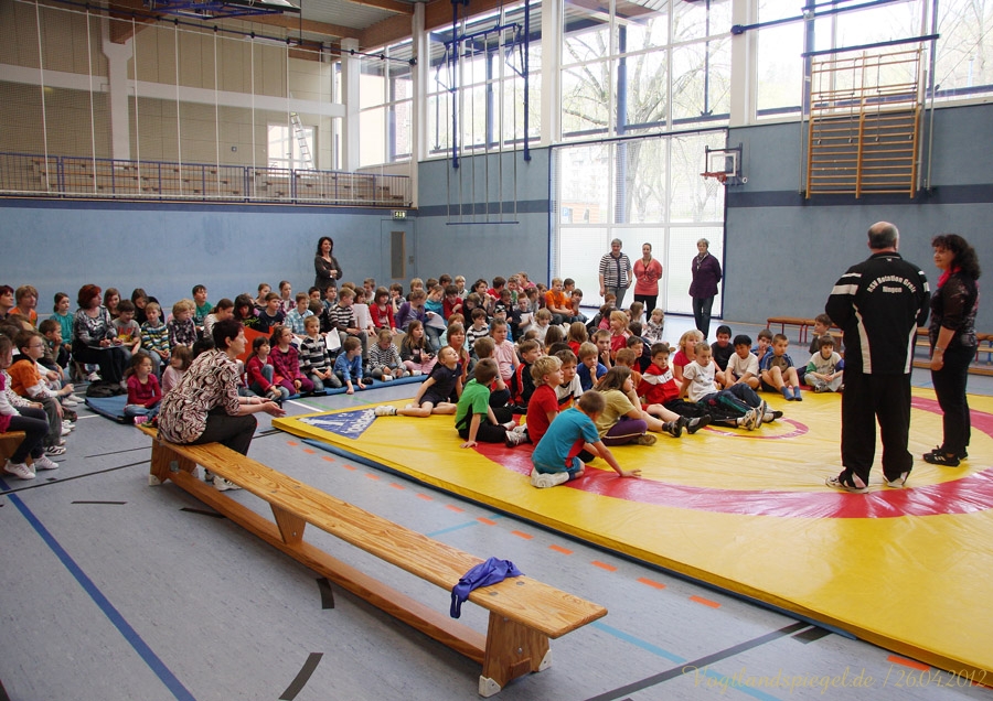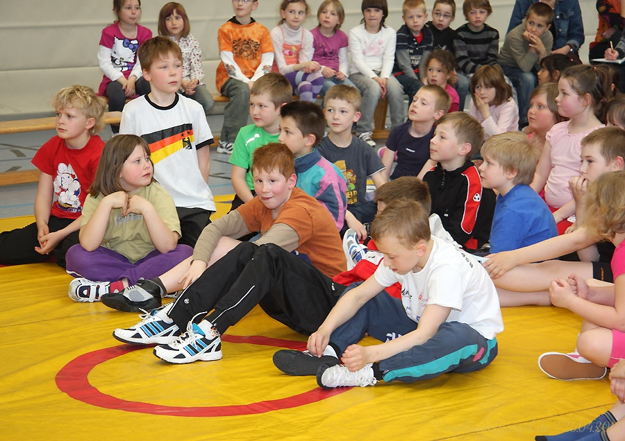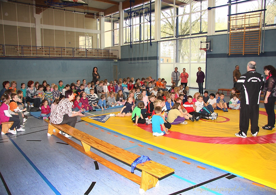 Zwanzig ringkampfinteressierte Mädchen und Jungen erhielten eine Einladung zur Arbeitsgemeinschaft Ringen jeweils donnerstags zwischen 13.30 und 15.00 Uhr am gleichen Ort.