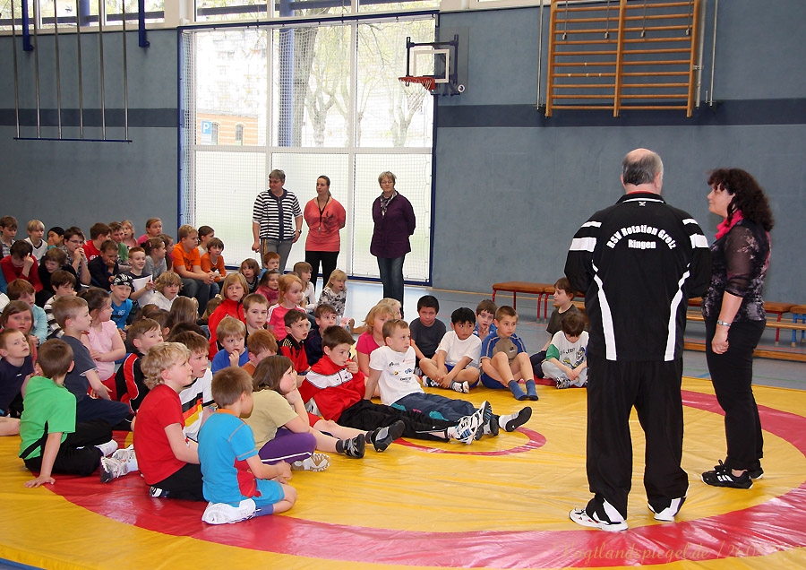 GREIZ. Dort trug die Lessing-Grundschule die schon zur Tradition gewordene Schulmeisterschaft im Ringen aus. Eingeladen zu dieser Meisterschaft hatte der RSV Rotation Greiz, der seit 1997 einen Trainingsstützpunkt in der jetzigen Mehrzweckturnhalle etreibt. Jugendwart Andreas Mattern, bei der Durchführung der Veranstaltung unterstützt von Siegfried Lippke, Klaus Kießling und Hans-Peter Zipfel, hatte die Meisterschaft mit der Schulleiterin Marlies Langebach akribisch vorbereitet. Eingeladen wurden die interessierten Kinder der Klassen 1 bis 4. Für alle, die sich sportlich betätigen wollten, lag eine Einverständniserklärung der Eltern vor. Im Vorjahr, damals noch in der Turnhalle der Goetheschule, traten 24 Schüler und Schülerinnen an. Diesmal wollten sich 31 Kinder auf der Matte erproben. Darunter waren auch 9 Mädchen, vor einem Jahr waren es noch 5. Andreas Mattern gab nach dem Wiegen einen kurzen Überblick über die vereinfachten Ringerregeln. Dann ging es auch schon los. Zuerst traten die bereits im Ringkampf aktiven Sportler der Lessing-Grundschule in Aktion, die auf Landes- und mitteldeutscher Ebene bereits manchen Erfolg errungen haben. Damit war das Eis gebrochen. Nun wollten auch die Neulinge auf die Matte. Die Begeisterung kannte keine Grenzen. Die Ringkampfneulinge wurden von den zahlreich erschienenen Klassenkameraden frenetisch angefeuert, so dass es kaum noch möglich war, die Aufrufe zum nächsten Kampf zu verstehen. Die Nichtaktiven hatten im Werkunterricht und zu Hause, teilweise mit Hilfe der Eltern, Plakate zur Anfeuerung ihrer Favoriten gebastelt, die nun Verwendung fanden. Auf der Matte wurde begeistert gekämpft. Manchmal musste auch ein schon wie ein sicherer Sieger Aussehender wegen der noch nicht so recht verstandenen Regel noch eine Niederlage hinnehmen. Nach den offiziellen Kämpfen kamen auch noch Freundschaftskämpfe zur Austragung. Hier hätte der Neuling Florian Heyer fast für eine Sensation gesorgt, als er gegen einen Aktiven fast gewonnen hätte.