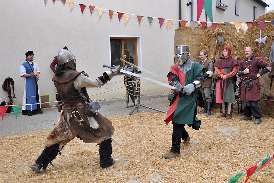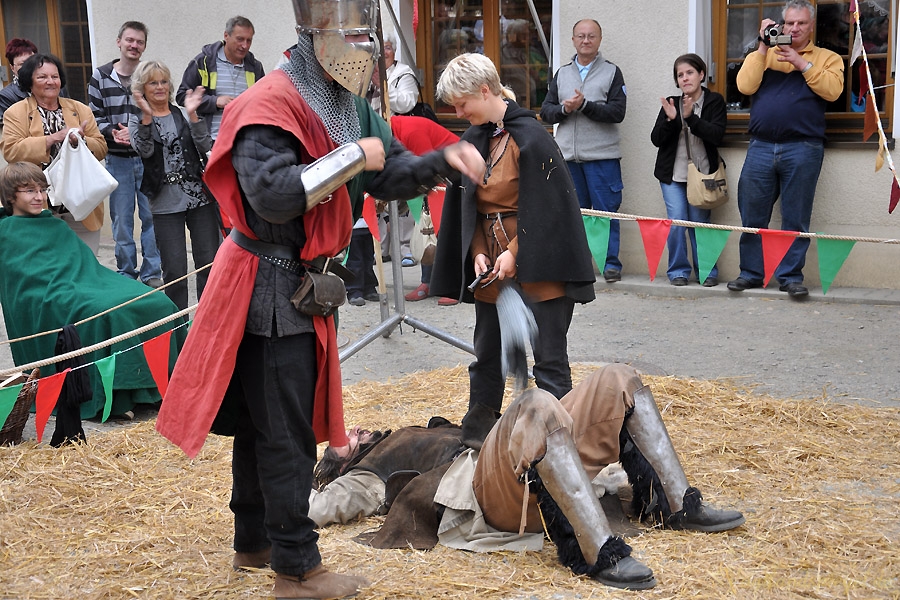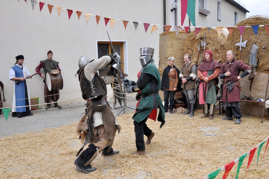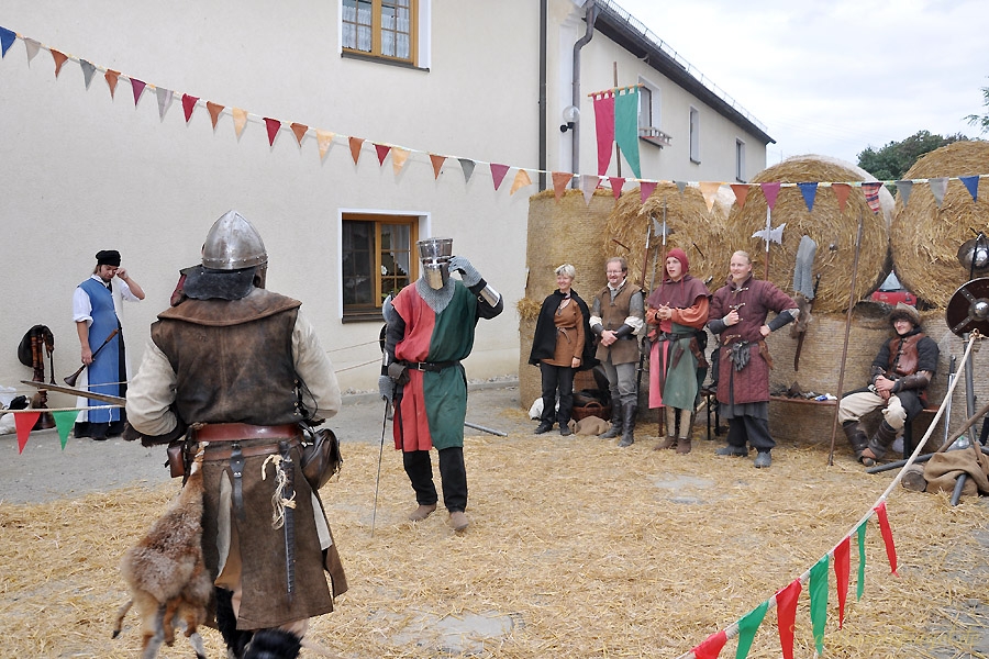 Mittelalterliches Bratwurstfest im Sachswitzer Landgasthof Petzold wird zum Besuchermagneten Mittelalterliches Bratwurstfest im Sachswitzer Landgasthof Petzold wird zum BesuchermagnetenSACHSWITZ. »Hier oben waren wir noch nie, das ist ja Idylle pur«, freuten sich am Sonnabendnachmittag Peter und Kerstin Zeiner. Wie viele andere Gäste hatten sich die Greizer auf den Weg zum Mittelalterlichen Bratwurstfest in den Landgasthof Petzold gemacht. In herbstlich gestaltetem Ambiente traf sich „allerley fahrendes Volk“ zu Ritterkämpfen, Gesängen und zu gemütlicher Runde bei Bier und natürlich Rostern. Dass dabei der amtierende Bratwurstkönig Rudi I. – der kürzlich seine zweite Amtszeit antrat – und die Suhler Grillzwerge nicht fehlen durften ist klar. Rudi Butkus begeisterte zudem als Bauchredner, der mit Puppe Charlie Zwiegespräche hielt und die Gäste zu wahren Lachsalven bewegte. Die historische Modenschau des Greizer Mode- und Showteams sorgte im Zelt für aufmerksame Zuschauer, die beiden musikalischen Tavernen-Teufel trieben so manchen Schabernack und die Rittersfrauen präsentierten ihre feine Handarbeitskunst. Auch für Speis und Trank war bestens gesorgt, zum Beispiel fanden germanische Fladenbrote reißenden Absatz. Auch die Rostbratwurst für zwey Taler und die Scheibe vom deutschen Hausschwein für drey Taler erfreuten sich bei den Gästen größter Beliebtheit. Ein Streichelzoo lud die Jüngsten zur Begegnung mit Ponys, Alpakas und Kälbchen ein. Am Abend führte ein bunter Lampionumzug durch das Anwesen des Landgasthofs. Antje-Gesine Marsch @15.09.2012