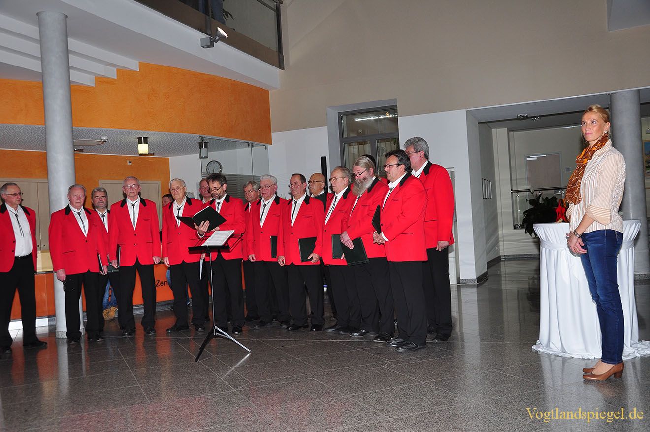 Oberarzt Udo Brandt (M.) begrüßt die Gäste des Weihnachtskonzerts im Kreiskrankenhaus Greiz. Rechts Hausdame Antje Täubert.