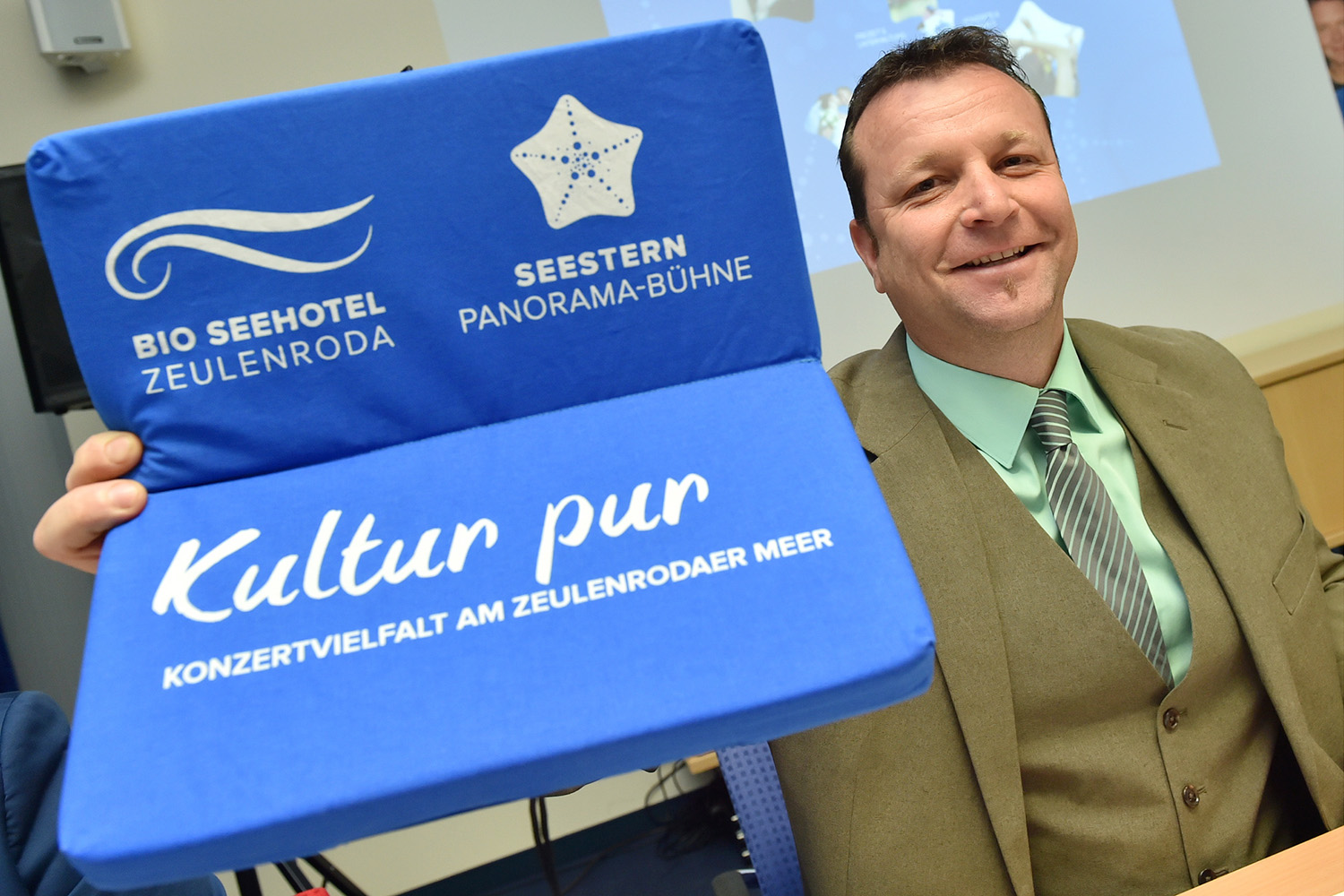 Marco Lange, Hoteldirektor Bio-Seehotel, präsentiert das passende Sitzkissen für die frisch montierten Sitzschalen der Seestern Panorama-Bühne.