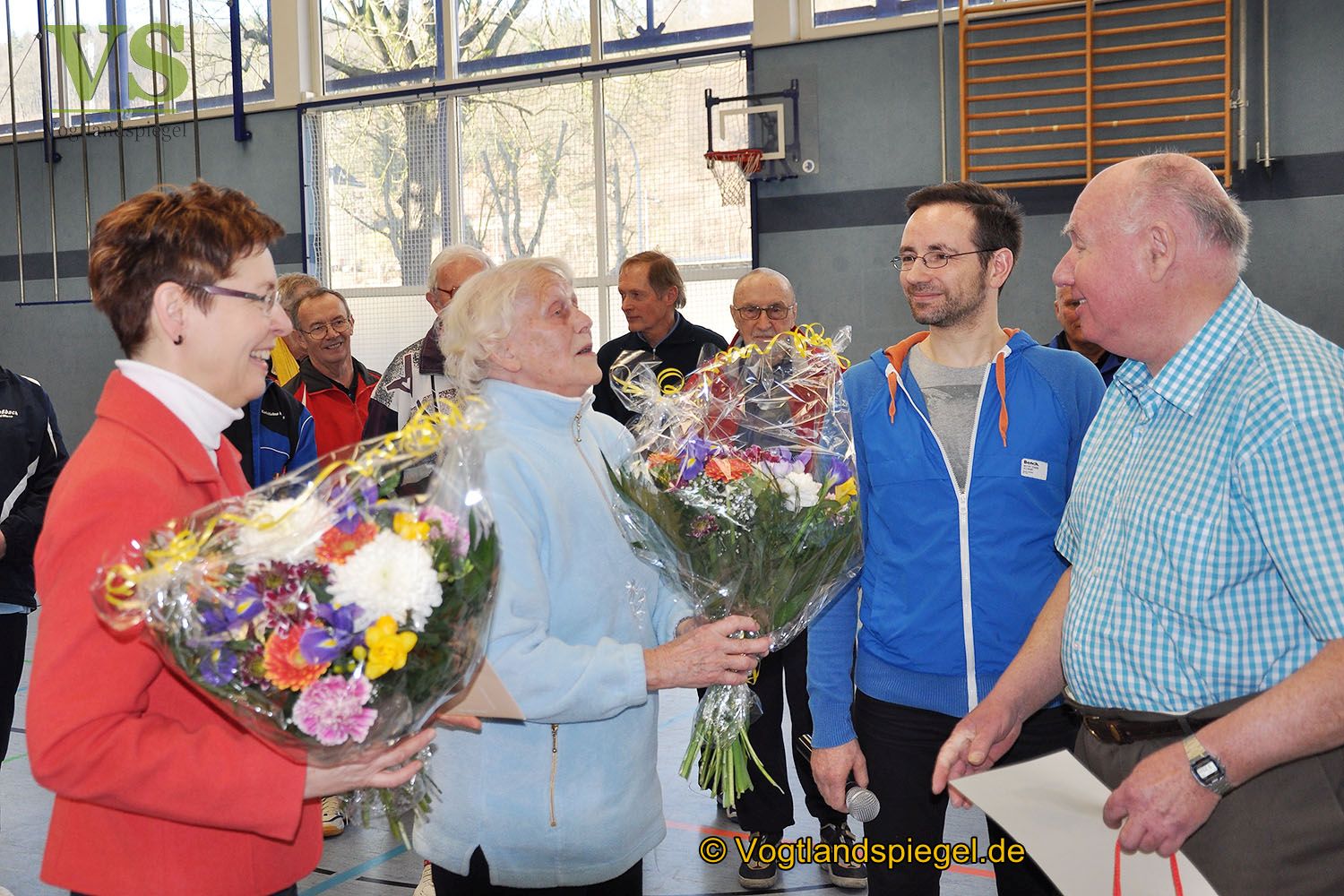 An zwei Tagen kämpften Senioren aus ganz Thüringen um die Qualifikation zur Mitteldeutschen Meisterschaft im Tischtennis. Auch Turnierleiter Karl-Heinz Baumgardt (r.) gratuliert Ingrid Frühauf.