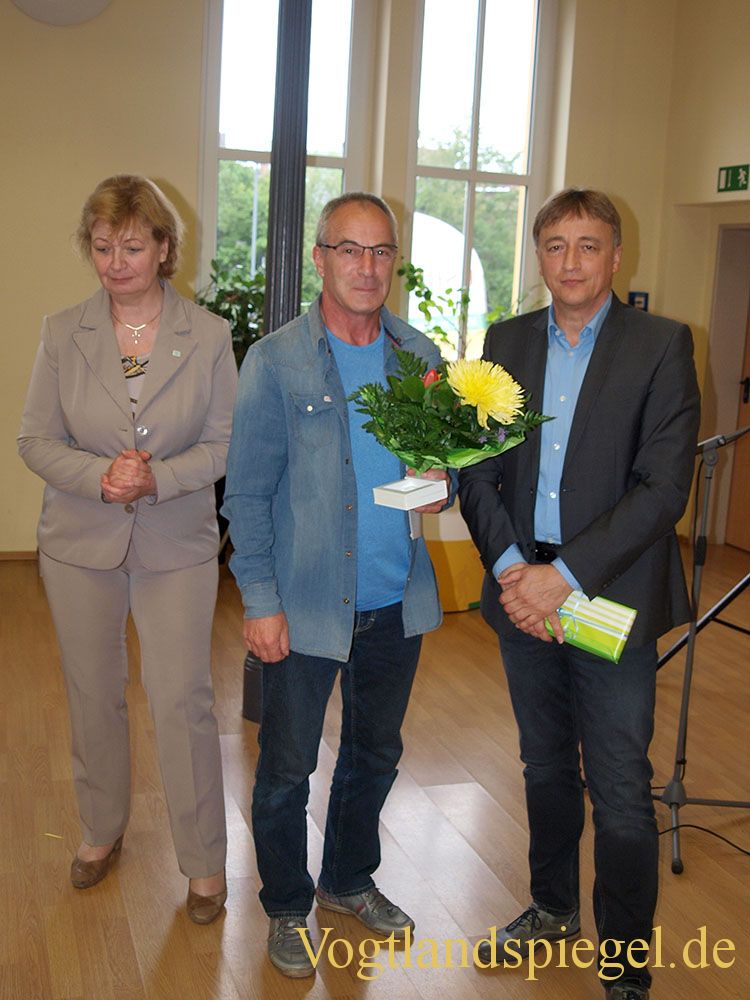 Michael Lippert (M.) erhält von Martina Schweinsburg und Uwe Jahn eine Auszeichnung.