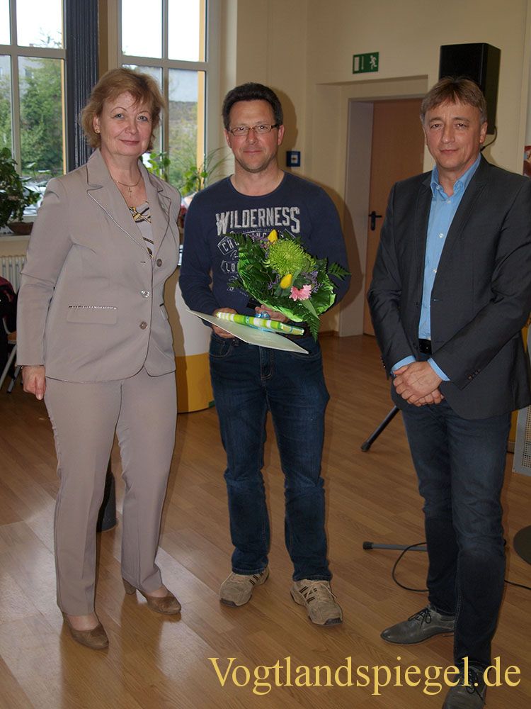 Martina Schweinsburg und Uwe Jahn überreichen eine Auszeichnung.