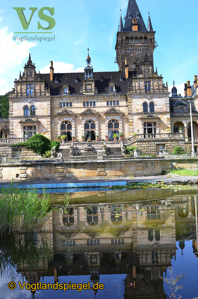 Im Teich spiegelt sich das Schloss Hummelshain.