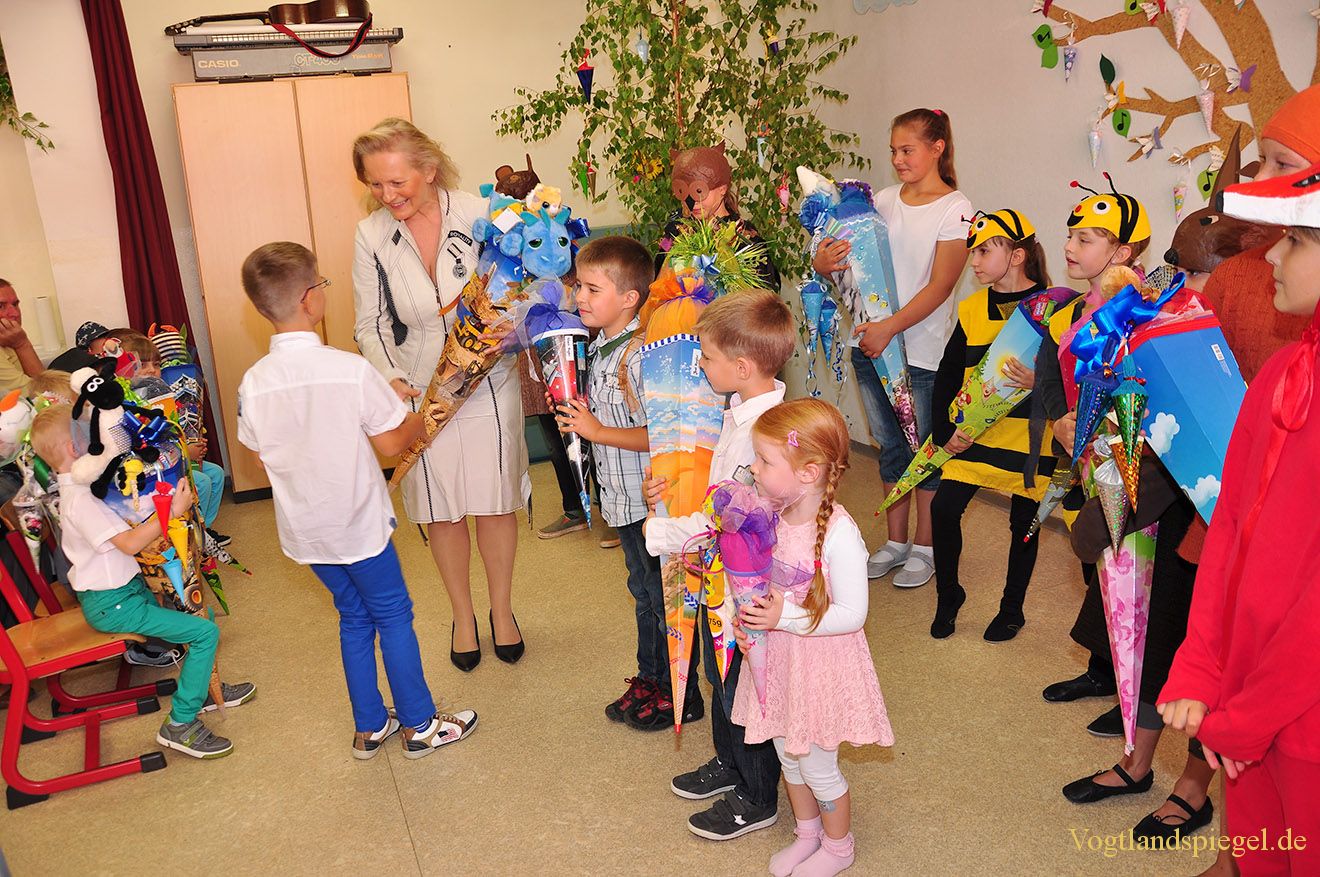 Schulleiterin Antje Schwarzkopf überreicht die Zuckertüte.