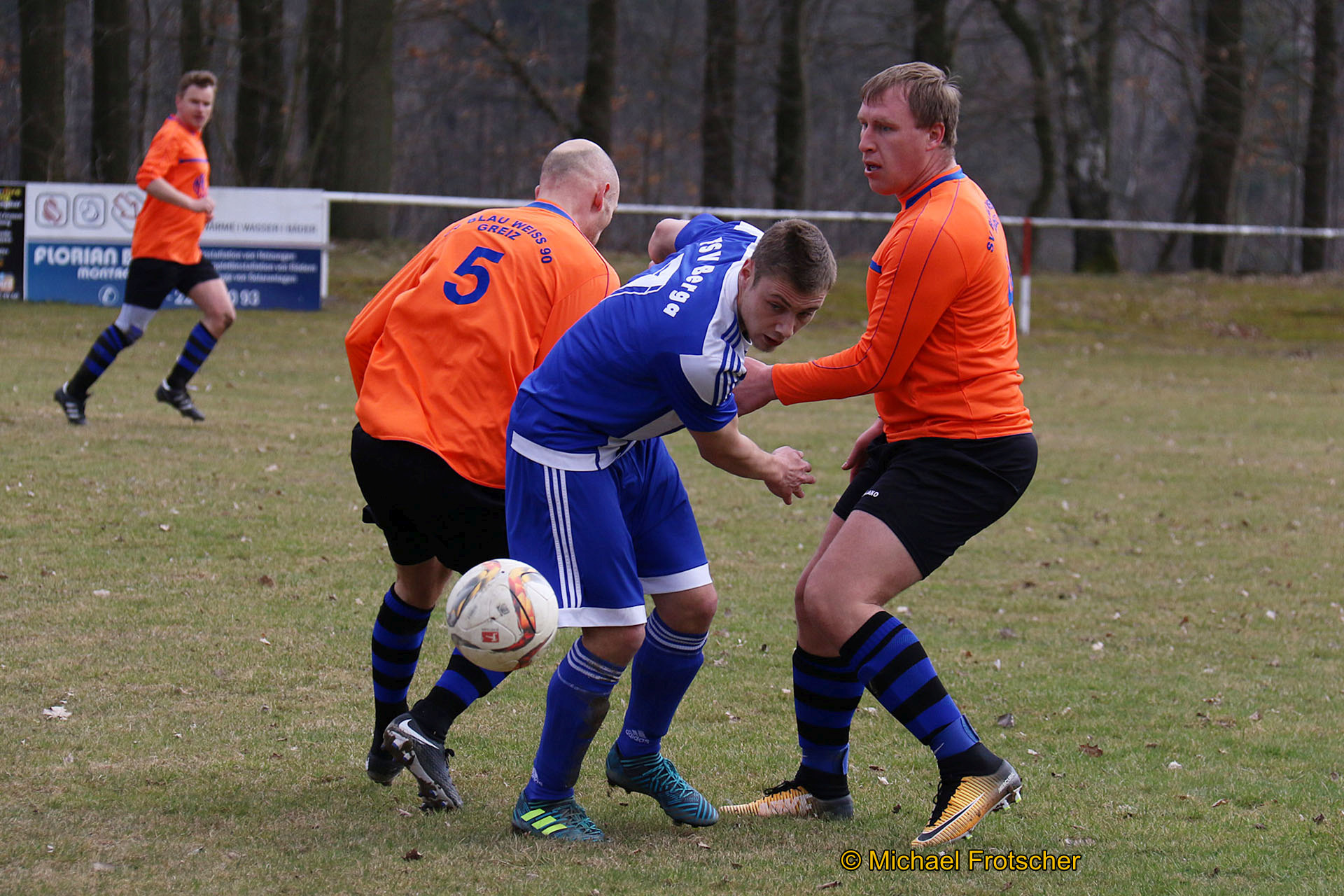 Im Kampf um den Ball konnte sich Chris Fischer aus Berga gegen Norman Voss(5) und Martin Oettel durchsetzen.